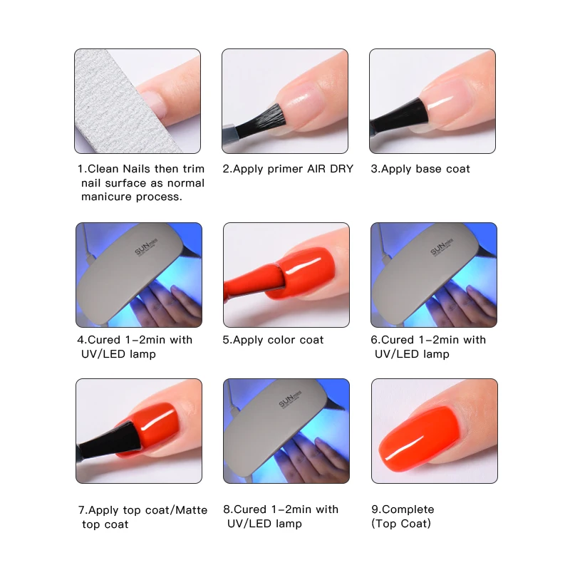 4.-Повторите 2-е тонкое покрытие гель-лака для ногтей. Очистите светодиодную лампу в течение 30 секунд или УФ-лампу в течение 2 минут.