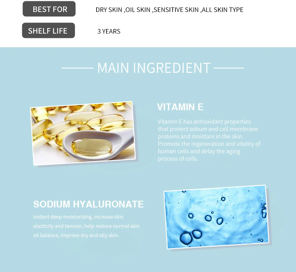 1.Гиалуроновая кислота имеет высокую степень водыУдержание. Гиалуроновая кислота является идеальнымУвлажняющий ингредиент для очень сухой кожиИли сильно обезвоженной кожи.