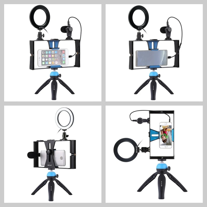 Puluz 4 в 1 Vlogging Live Broadcast смартфон видео установка + 4,6 дюйма кольцо светодиодный видео светильник и микрофон + крепление штатива + головка штатива