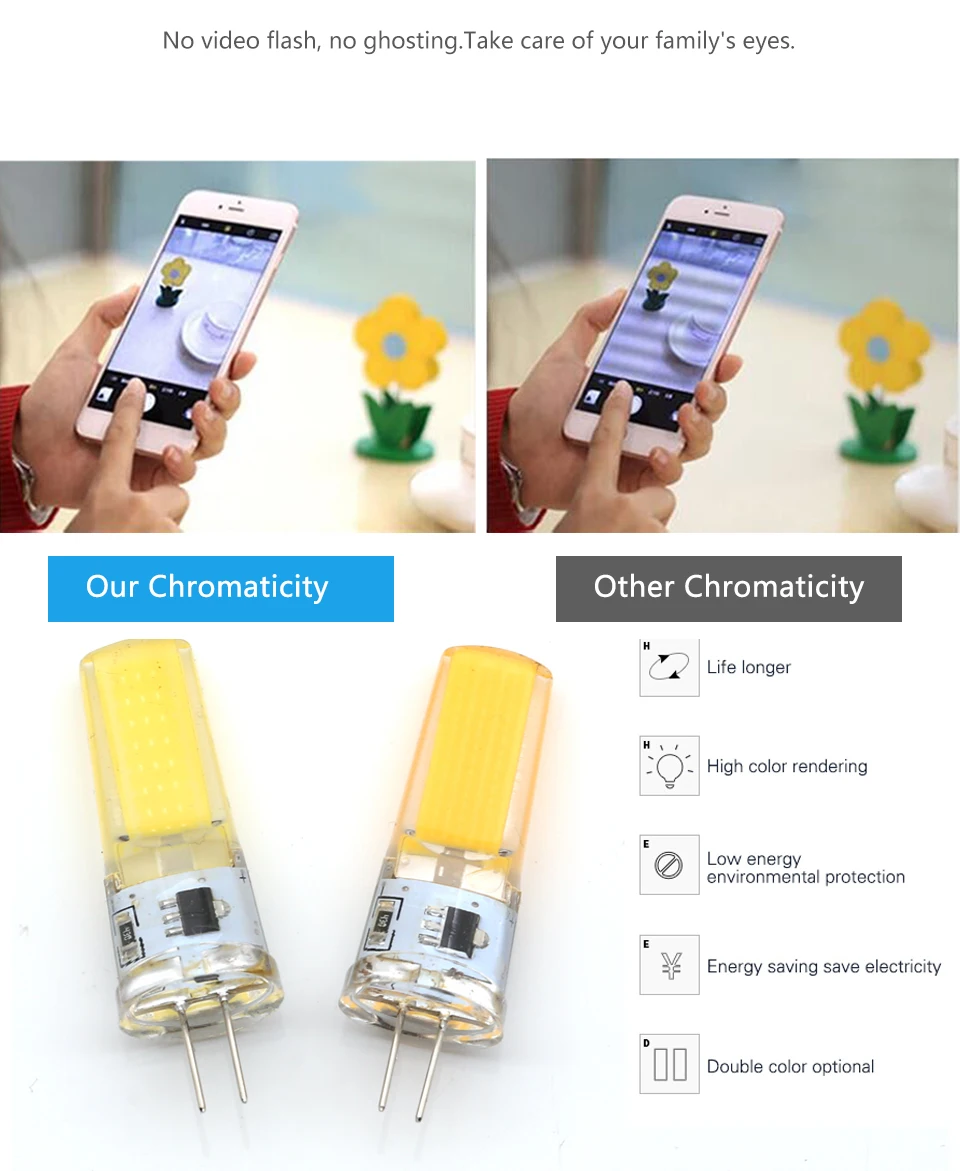 Характеристики: -Мощность: 3 Вт 6 Вт -6 W CanС регулируемой яркостью -Тип основания: G4 -Модель светодиодного чипа: COB LED -Угол луча: 360 градусов -Цветовая температура: теплый белый: 2800-3200 K, холодный белый: 6000-6500 K -Применение:Люстры, кухни,Гостиные, столовые,Спальня