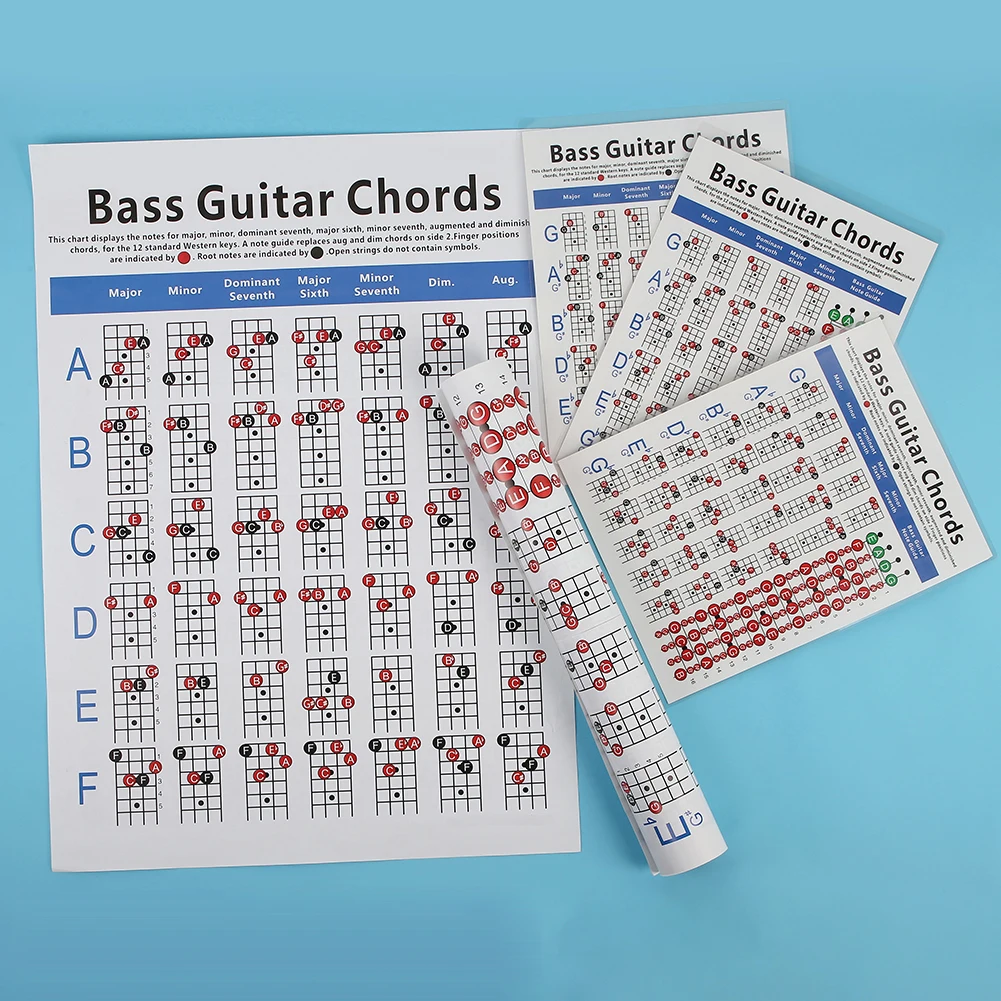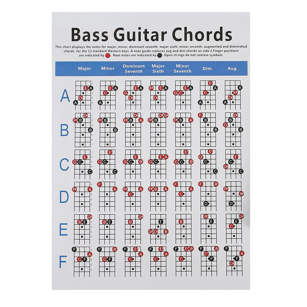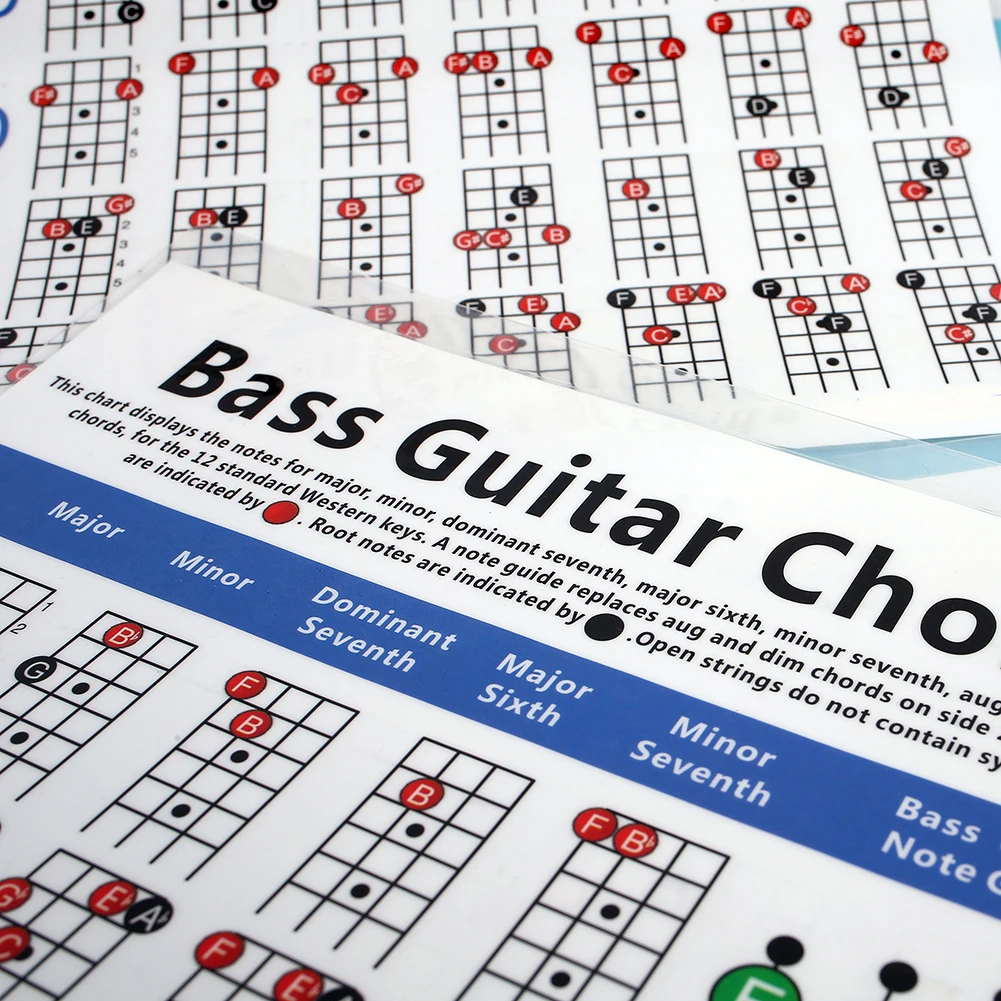 -В этой ламинированной таблице размеров А4 отображаются общие формы нот для бас-гитары «4 String», настроенные на E, A, D и G.