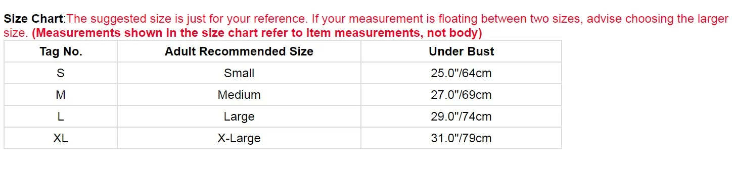 Размер на бирке. Взрослый рекомендуется Размеры Обхват под грудью S Маленький 25,0 "/64 см М Средний размер 27,0 "/69 см L Большой 29,0 "/74 см XL X-большой 31,0 "/79 см