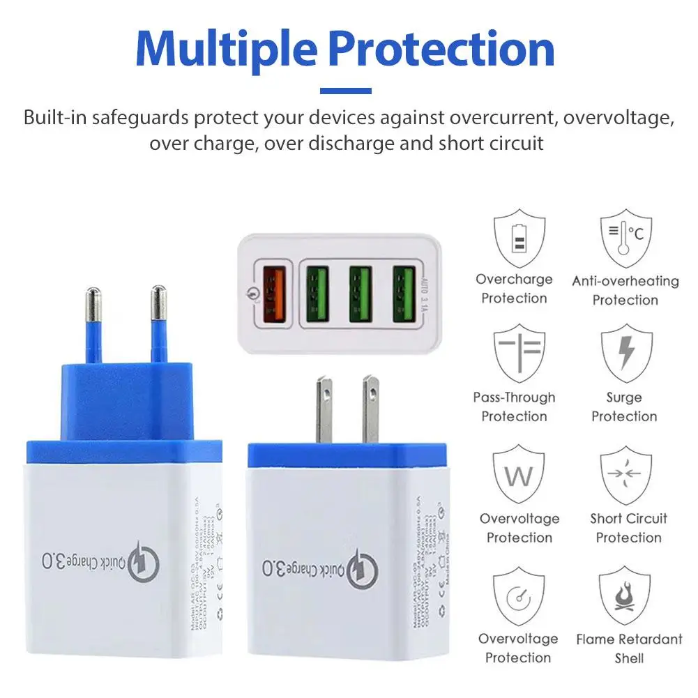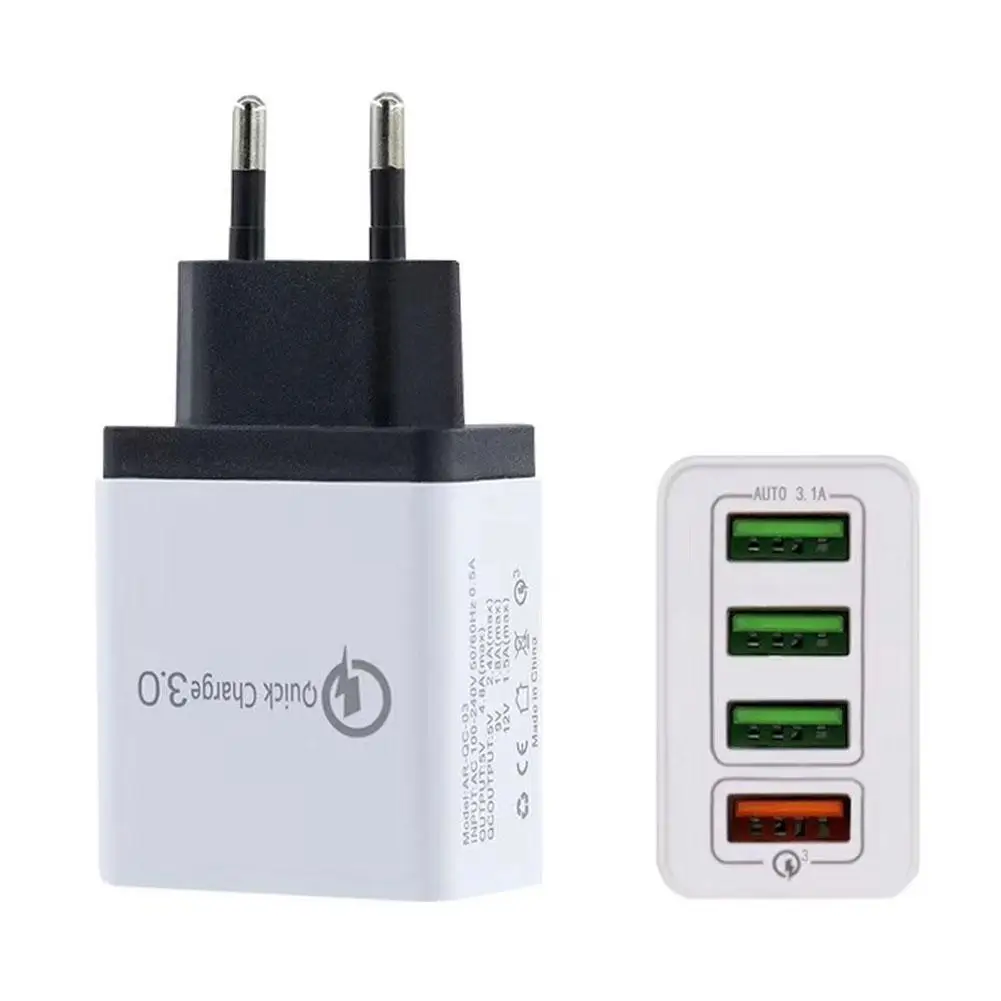 4 USB Mobile Phone Flash PC Fireproof Material Charger Quick Charge QC3.0 Charger Fast 4 Port EU Plug US Plug Travel Charger #GJ Features: 1. Build-in Quick Charger 3.0 technology, Up to 4X faster than standard chargers, able to charge QC3.0 enable devices to 80% in just 35 minutes. 2. Built-in safeguards protect your devices against overcurrent, overvoltage, over charge, over discharge and short circuit. 3. High standard PC fireproof material to protect the internal structure of the charger. 4. 4 USB ports can be charged at the same time and provide Max 5.4A output totally. 5. Support various devices, as mobile phone, iPad, PSP, eBook, tablet, power bank, etc. 6. Mini size, convenient to carry, Suitable for home, travel, office, etc.