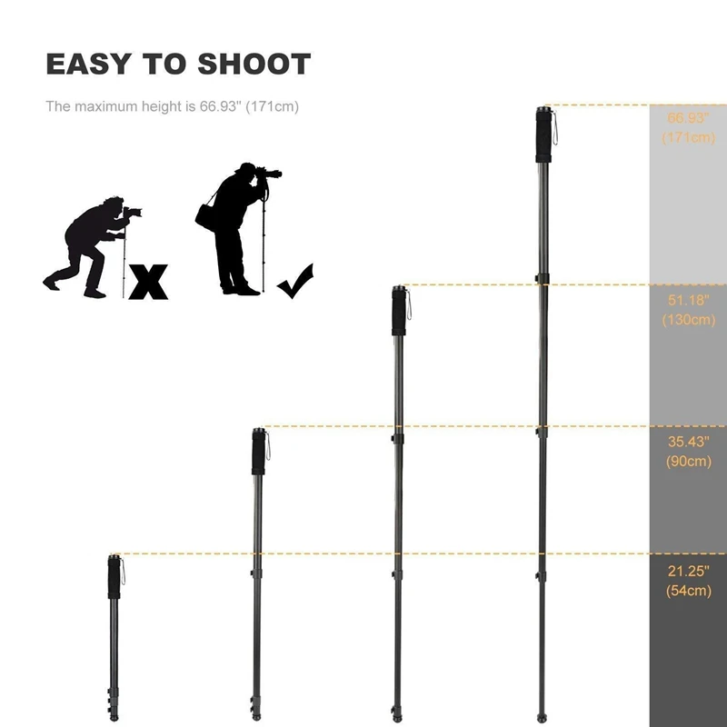Благодаря 4 быстросъемным ногам, которые фиксируются на месте, монопод может растягиваться до 67 дюймов, чтобы помочь вам получить любой снимок, который вам нужен.