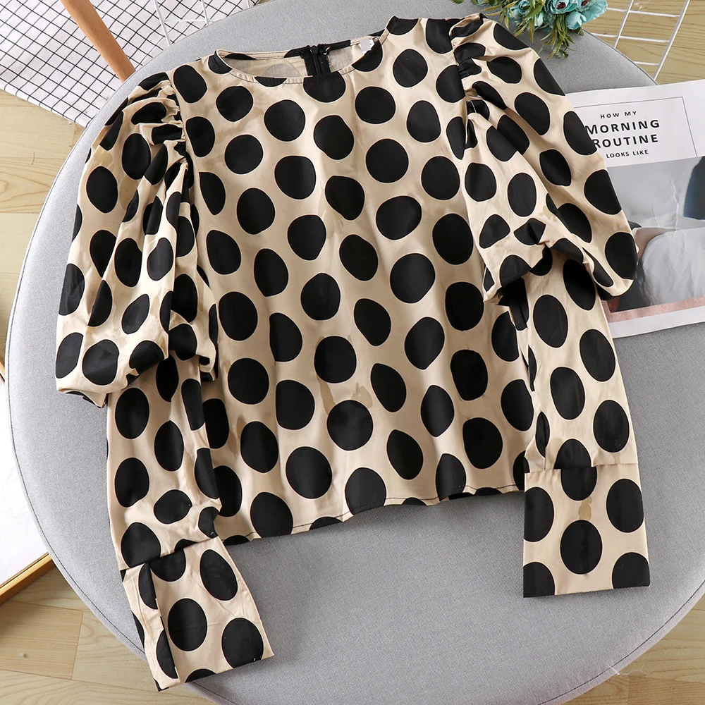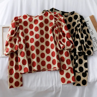 Женская туника с принтом в горошек, пышная блузка с длинным рукавом и круглым вырезом, Модная элегантная офисная рубашка на лето-осень 2019