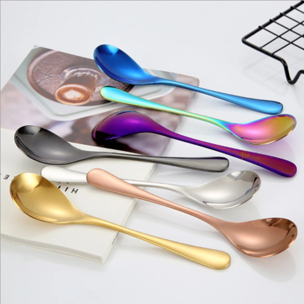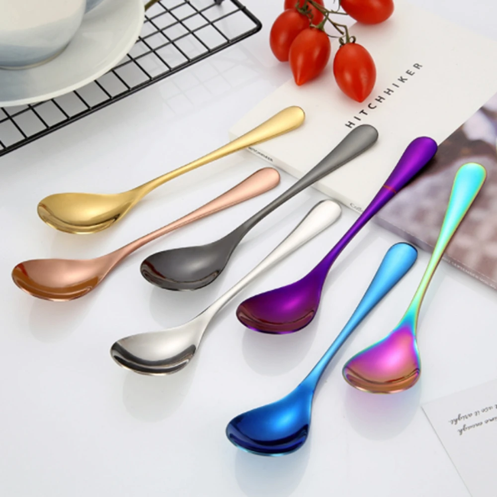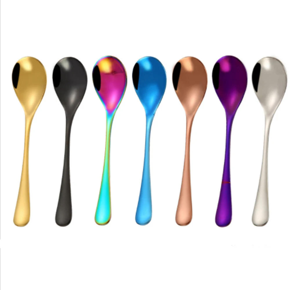 Материал: нержавеющая сталь. Размер: круглая Ложка 16*3,5*1 (см); Цвет: серебристый, золотой, розовое золото, черный, цветной, синий, фиолетовый, серебристый Тип: Кофе ложка Посылка включает в себя: 1 * кофейная ложка