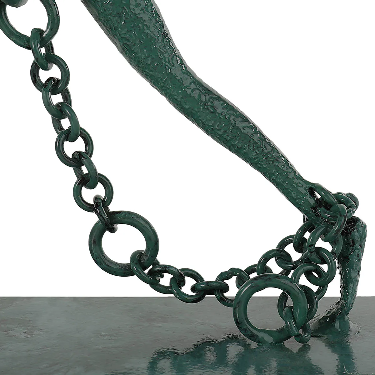 Фигура заблокирована железной цепью, и его руки подняты и сопротивляются, сохраняя борьбу. Даже если Он несчастен, он все равно никогда не уступает и никогда не остановится. Эта скульптура является первоначально разработанным произведением художника Джеймса ли, профессиональных мастеров, изготовленных различными процессами, такими как формование, обжиг, литье и окраска. Это очень изысканно. Поверхность украшена зеленой краской в стиле ретро, которая является экологически чистой и не выцветает. Внешний вид является равномерным и блестящим, показывая очаровательную железную текстуру. Специальное художественное украшение может быть помещено в гостиную, офис или кабинет как символ непреклонного духа. Это также вдохновляющий художественный подарок.