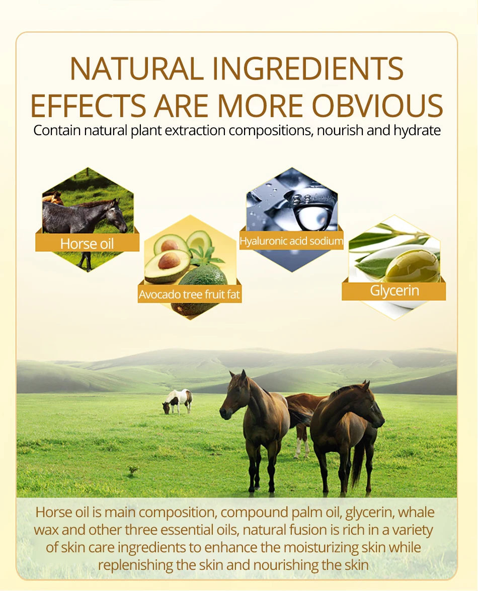 Конское масло является основным составом, составной пальмовое масло, глицерин, Кит воск и другие три эфирных масла, натуральное слияние богато множеством ингредиентов по уходу за кожей для усиления увлажнения кожи, одновременно восполняя кожу и питая кожу.
