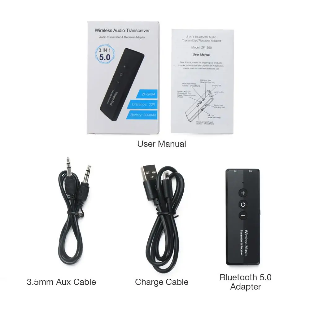 Упаковочный лист: 1 x адаптер Bluetooth 5,0 1x3,5 мм Aux кабель 1 x кабель для зарядки Руководство пользователя (1 шт.)