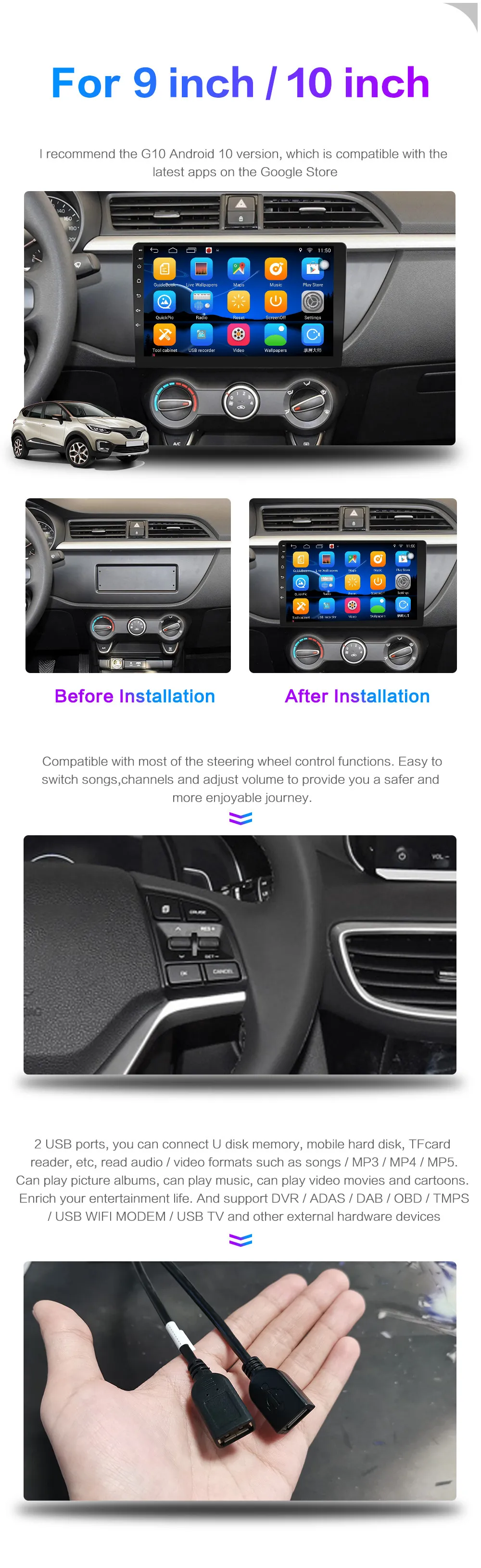 2 Din Android 10 Автомобильный мультимедийный видео плеер 9 "10" Универсальный 2DIN стерео автомобильный Радио GPS для Volkswagen Nissan Hyundai Kia toyata Новое поступление: RAM + ROM 2G + 32G разрешение: 1024*600. Емкостный сенсорный экран радио чип: FM поддерживает настройки логотипа 2 din Android мультимедийный плеер для универсальных большинства старых автомобилей он широко известен как автомобильный dvd-плеер, но он не может воспроизводить DVD диски. Он может подключаться к внешнему dvd-плееру через USB. Что в упаковке: 1 шт. * Автомобильный мультимедийный проигрыватель на базе Android 1 шт. * Кабель питания 1 шт. * кабель RCA 2 шт. * USB кабель 1 шт. * кабель RCA (подходит для камеры заднего вида) 1 шт. * GPS антенна Основные характеристики: 1. Операционная система Android, вы можете установить приложения, приложения, Google Play Store, Skype, Facebook, YouTube, Twitter и многое другое. 2,9/10 дюймов HD емкостный сенсорный экран: 1024*600 разрешение, не 800*480 3. Шнур питания легко подключить, просто подключите его непосредственно в шнур питания. 4. Формат Мультимедиа: MP3, MP4, WMA, JPEG и т. д. Поддержка воспроизведения видео 1080P 5. Поддержка Bluetooth hands-free, поддержка телефонной книги 6. Поддержка оригинальной кнопки рулевого колеса автомобиля 7. Встроенная антенна Wi-Fi для подключения к ближайшим точкам доступа Wi-Fi. Используйте телефон в качестве точки доступа к Wi-Fi. 8.FM Частотный диапазон: 87,5-108 МГц, FM интегрирует 18 предварительно настроенных сайтов 9. Поддержка логотипа, изменение логотипа 10. Языки с множеством экранных меню: китайский (упрощенный), русский, испанский, турецкий, русский, иврит, итальянский, китайский (традиционный), арабский, французский, немецкий, английский, португальский, 48 языков, включая корейский, Таиланд и т. д. эта посылка включает в себя: 1 Автомобильный gps-плеер на базе Android 2 usb кабель 1 GPS антенна 2 RCA кабеля 1 кабель адаптер общая проблема: Могу ли я слушать музыку или радио при использовании навигации? Да, вы можете слушать радио или музыку во время использования навигационной системы. Устройства Clayton используют уникальную технологию, которая позволяет слушать музыку во время использования навигационной системы. Примечание: 1. Пожалуйста, обратите внимание на вашу модель и год при покупке заказа. 2. Продукт не имеет слота SD, но имеет два слота USB 3. Если у вас есть другие вопросы, пожалуйста, обратитесь в службу поддержки клиентов магазина.
