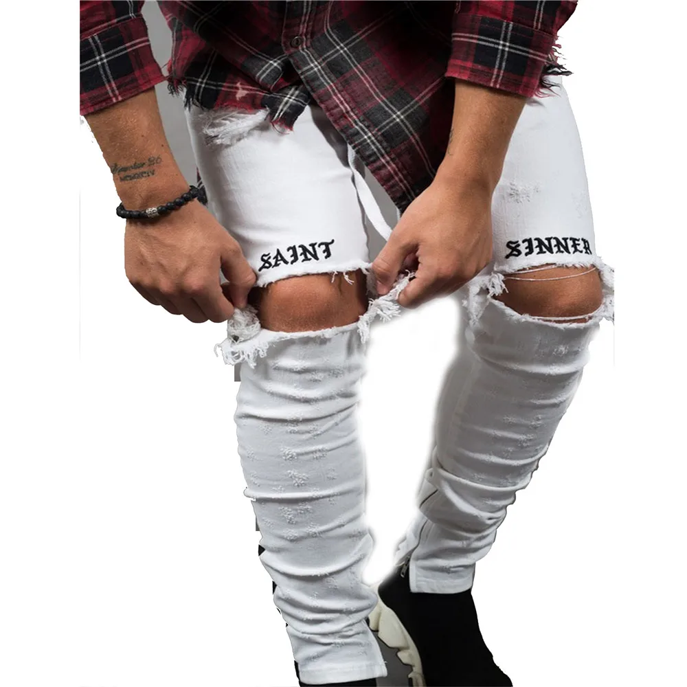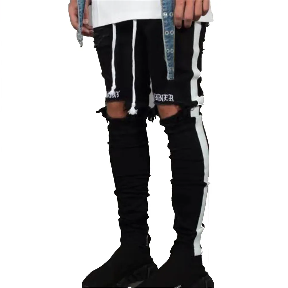 Новые модные обтягивающие мужские стильные рваные брюки, байкерские узкие прямые потертые джинсовые брюки, мужские брюки в стиле хип-хоп