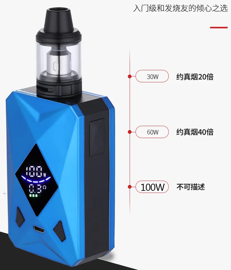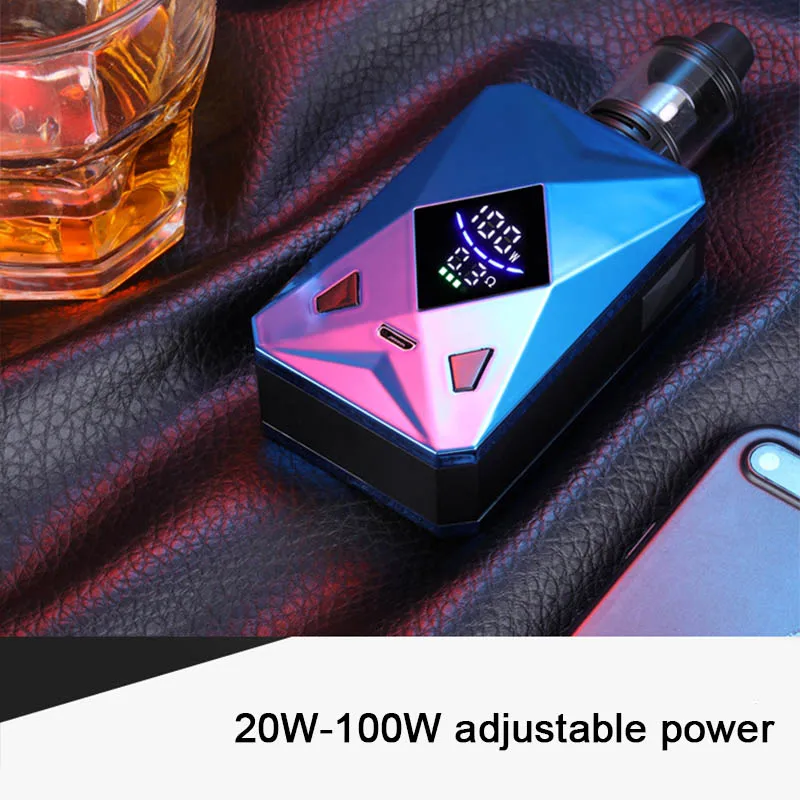 Информация о продукте: Емкость аккумулятора: 2600 мАч Выходная мощность: 20-100 Вт Размер: 120*50*30 мм Емкость распылителя: 4,0 мл Сопротивление атомайзера: 0,3 Ом Время зарядки: 2 часа
