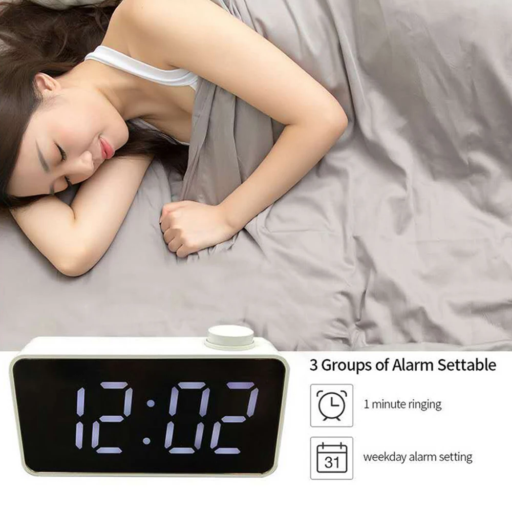 Это хороший цифровой Светодиодов Будильник с функцией зеркала, который имеет 3 уровня яркости, обеспечивает соответствующую яркость для четкого и удобного просмотра! Он может отображать время в формате 12 ч/24 ч и температуру в помещении в °C/°F. Он имеет функцию сигнализации и голосового управления. Кроме того, регулируется яркость светодиодов: тусклый и яркий.