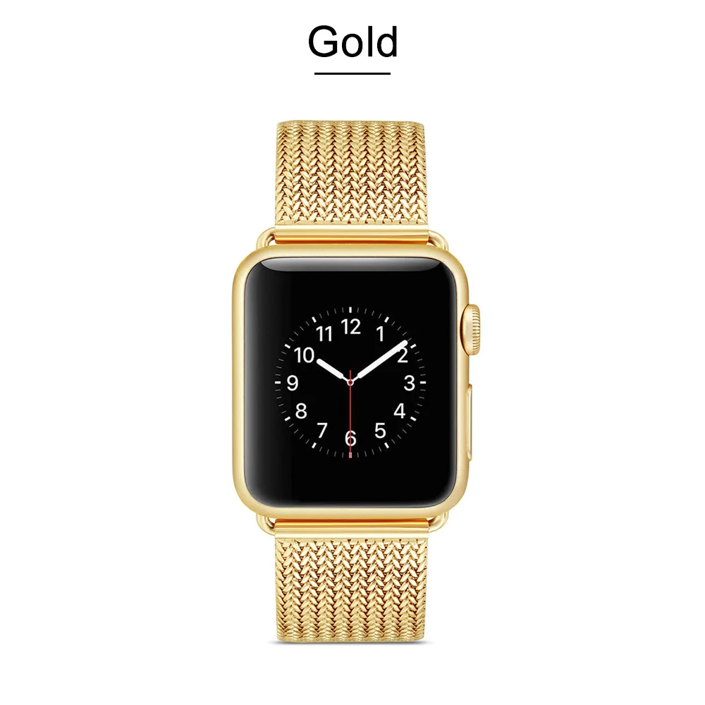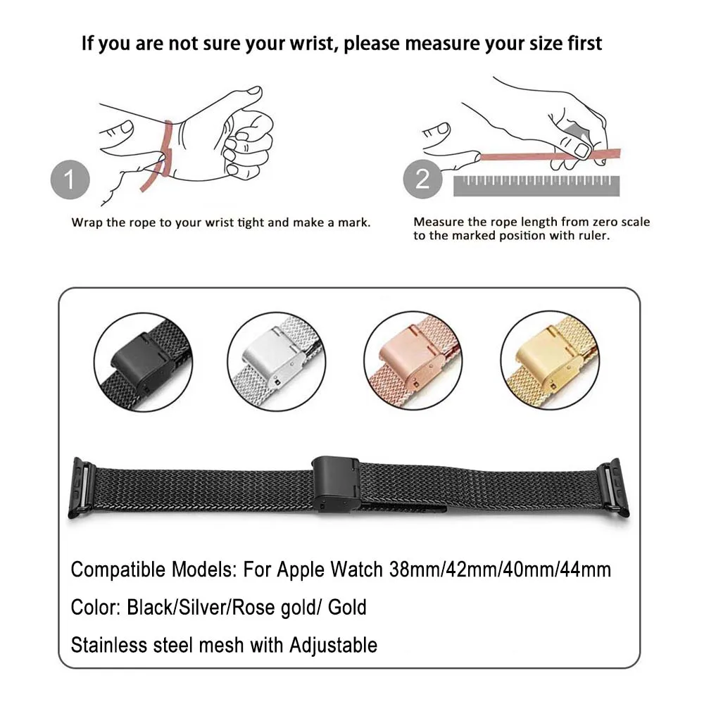 Тип: ремешок для часов Совместимые модели: для Apple Watch Series 5 4 3 2 1 Материал: нержавеющая сталь Цвет: черный/серебристый/розовое золото/золото Ширина ремешка: 38 мм, 42 мм, 40 мм, 44 мм Сетка из нержавеющей стали с регулируемой