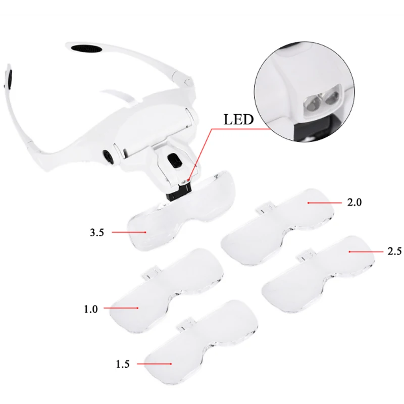 Особенности: Увеличительное стекло, светодиодный, удобный для использования. Если у вас довольно большая нагрузка, долгие рабочие часы, необходимо носить этот продукт в течение длительного времени, очки могут быть заменены в состоянии гарнитуры, что облегчает работу! Пять виды объективов с разными увеличениями доступны. Отрегулируйте угол объектива, чтобы увеличить фиксацию пружины. В условиях низкой светильник окружающей среды может открыть светодиодный светильник ing источник, с 5 Расширенный тип может изменить увеличение объектива. Угол освещения тоже регулируется. Технические характеристики: Цвет: белый Материал линз: Акриловая линза Аккумулятор: 3 батарейки AAA (не входят в комплект) Объектив: 1.0X / 1.5X / 2.0X / 2.5X / 3.5X Область обзора: 1.0X: 250 ~ 350 мм 1.5X: 200 ~ 300 мм 2.0X: 175 ~ 275 мм 2.5X: 150 ~ 250 мм 3.5X: 80 ~ 120 мм Размер: как на картинке Посылка список: 1 * Рамка 1 * повязка на голову 5 * объектив с коробкой