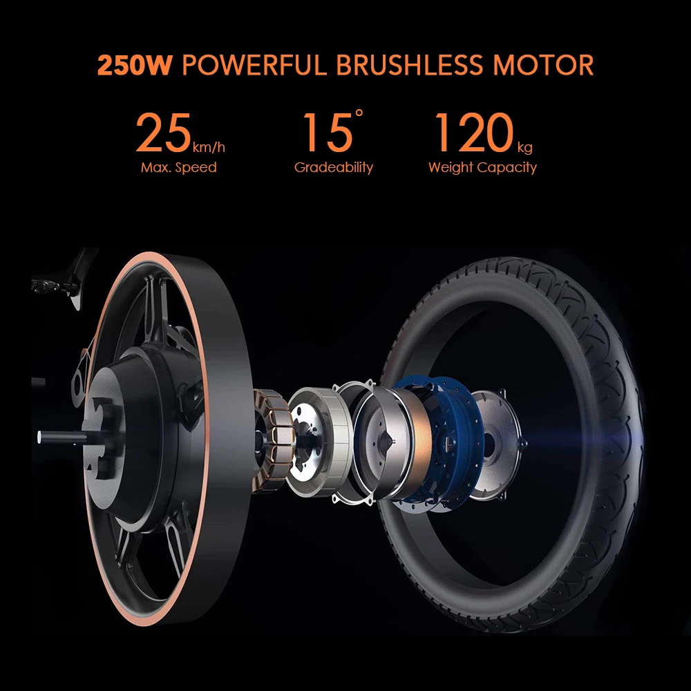 Мощный двигатель мощностью 250 Вт обеспечивает быструю скорость до 25 км в час.