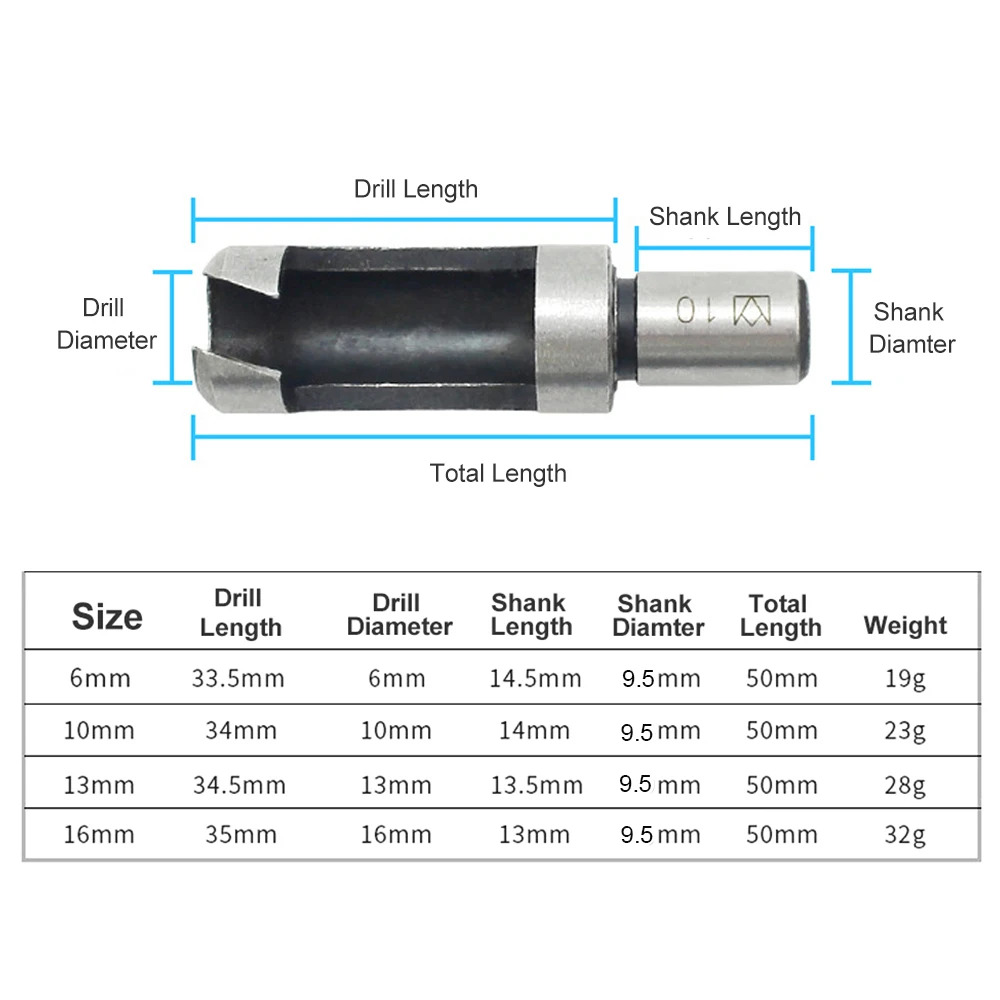Набор сверл с вилкой из дерева, 4 шт. в упаковке разных размеров (6 мм/10 мм/13 мм/16 мм).