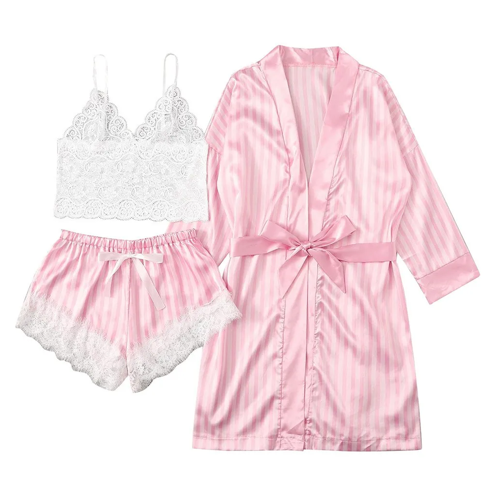 3 шт. для женщин кружево атлас беспроводной бюстгальтер камзол шорты пижамы полосатый халат