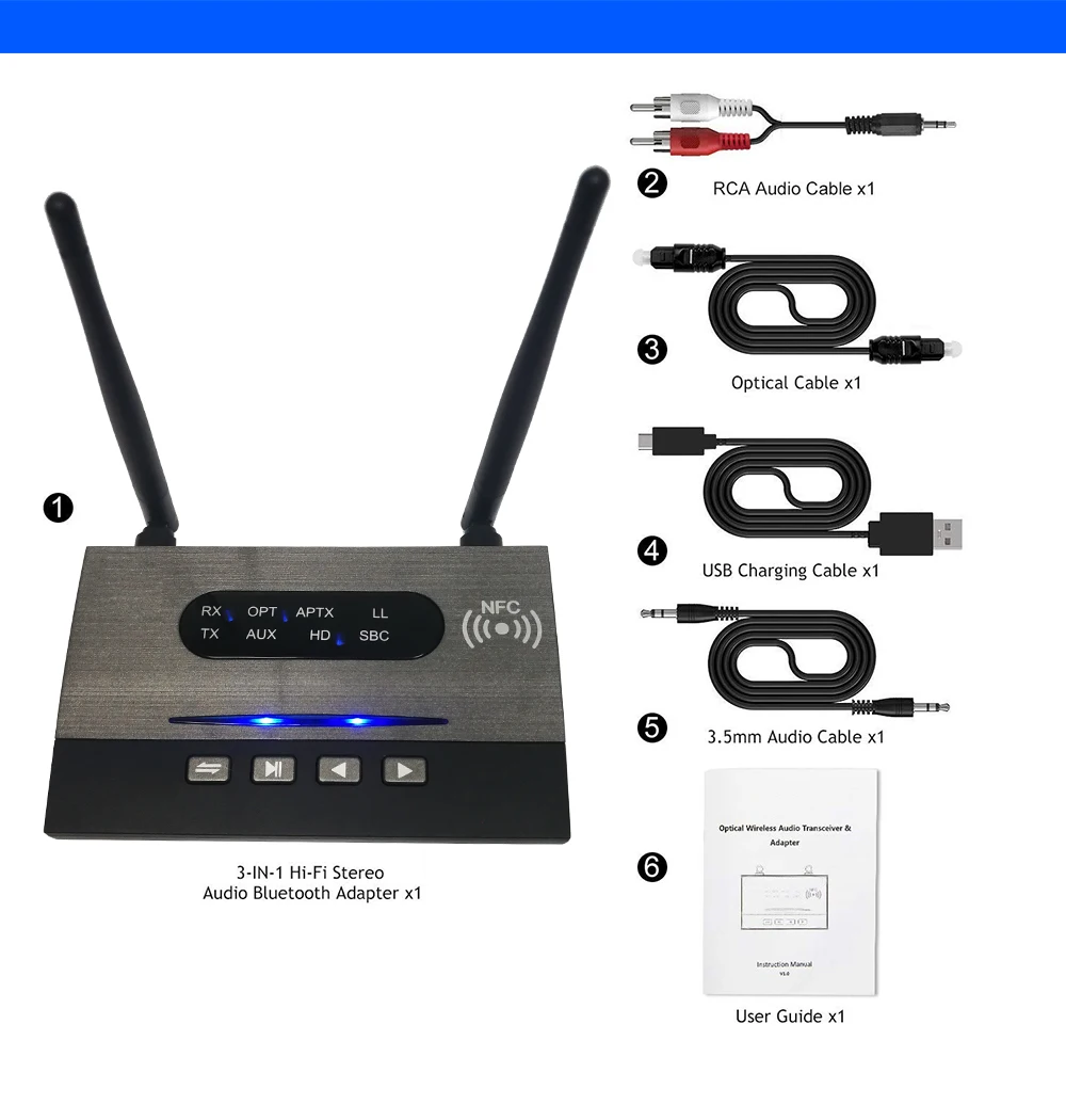 3-в-1 TX/RX/Bypass особенность и aux AV/RCA/оптический полнопроходным отверстием поддержка убедитесь, что эта BT-B22 подходящих для подключения практически со всеми аудиоустройствами, через Bluetooth/аудио кабель и передачу звука свободно