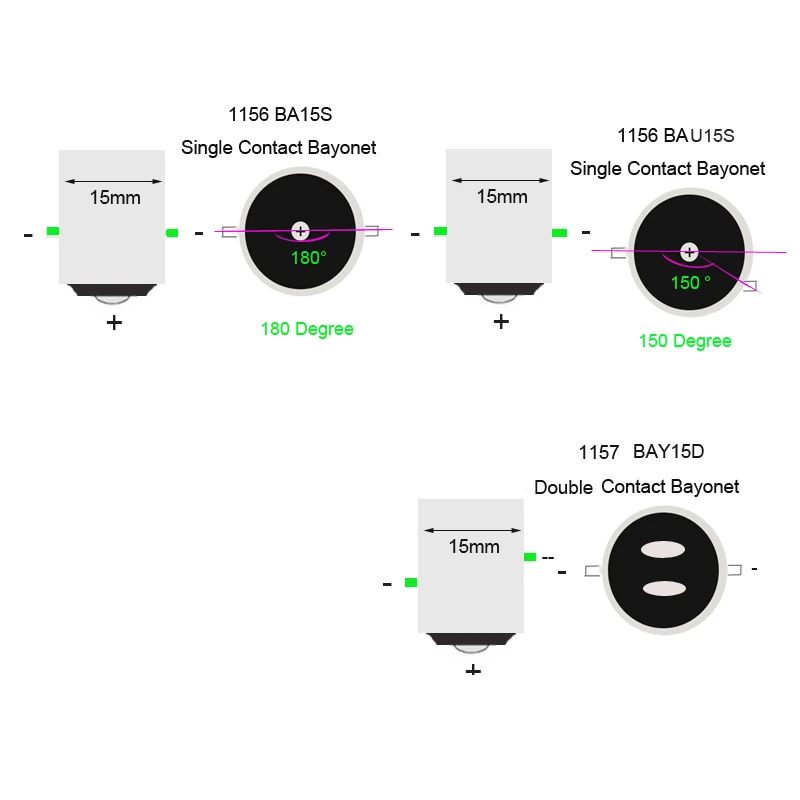 Как отличить 1156 BA15S и 1157 BAY15D(BA15D) 1156 BA15S P21W ------------------- одиночный контакт (два контакта 180 градусов) 1156 BAU15S PY21W ------------- одиночный контакт (два контакта 150 градусов) 1157 BAY15D(BA15D)-------- двойной контакт