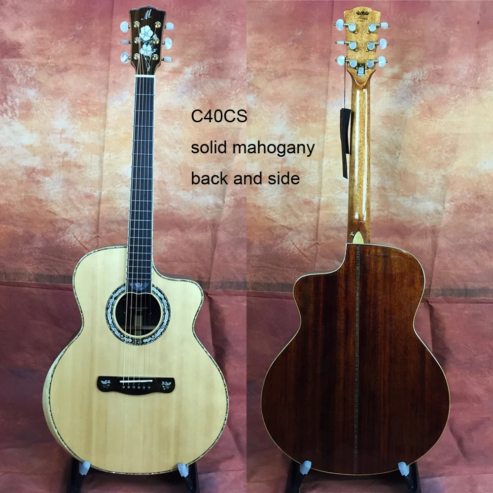 Модель: C40CS Форма корпуса: 41 дюйм GC cutway Верх: AAA однотонная ель engelmann Задняя и боковая сторона: однотонное красное дерево Средства ухода за кожей Шеи: красное дерево Гриф и гриф: розовое дерево Гайка и седло: коровья кость Туннинговые машины: Сделано в Тайване Строка: Daddario EXP