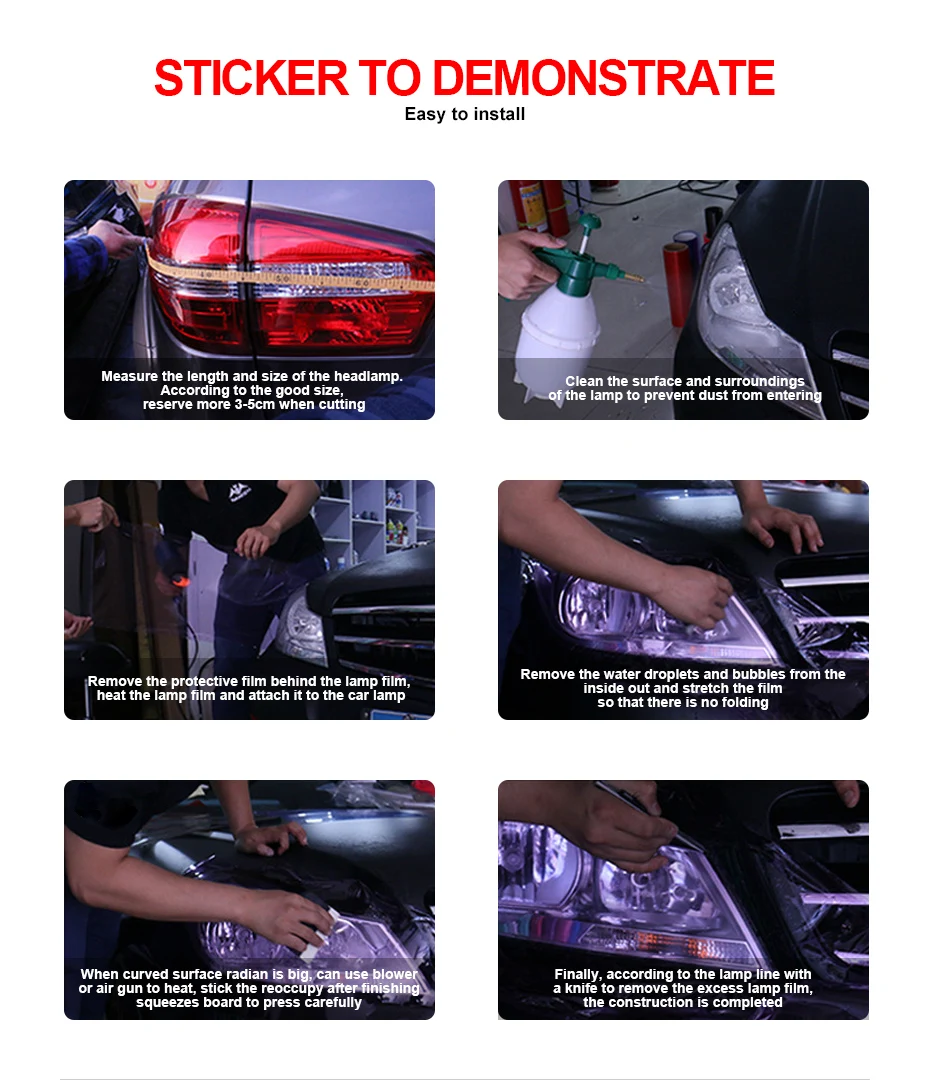 Очистка поверхности водой перед установкой поможет приклеить и очистить любые загрязнители, которые могут вызвать пятна. 1. Измерьте то, что вам нужно, и нарежьте его ножом. 2. Выберите место для крепления и очистите его влажным полотенцем. 3. Распылите тонкую воду на поверхность воды. 4. Разрывает пленку и распыляет на ней воду. 5. Высушите с помощью пистолета горячего воздуха, чтобы удалить воздушные пузыри. 6. Используйте инструмент еще раз, чтобы осторожно нажать на лампу, так как это повлияет на конечный результат. 7. Используйте нож для резки остальной части пленки.