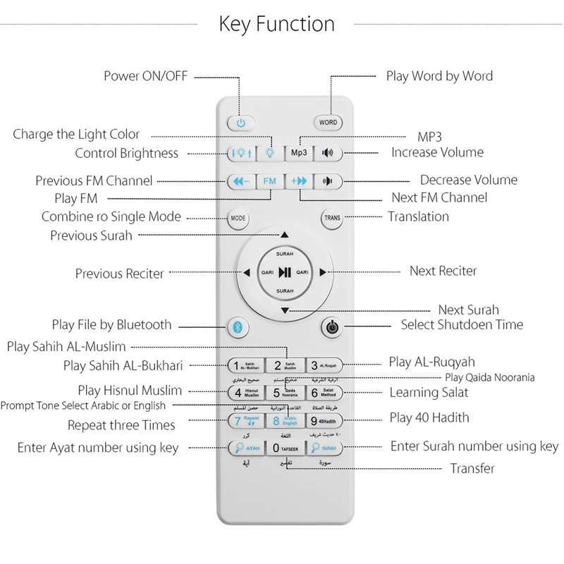 Основная функция: quran reciter, переводы, MP3, TF, FM, Bluetooth