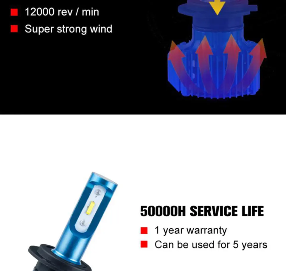 Тип вилки: H1 H4 H7 H11 H15 H16(JP) 9005 9006 9012 Мощность: 72 Вт/пара 36 Вт * 2 Напряжение: 11-30 В постоянного тока Чип: флип-чип CSP Люмен: 15лм/пара 7500лм * 2 Срок службы: >50000 ч Цвет: белый Цветовая температура: Белый 6500K Материал: авиационный алюминиевый профиль Рабочая температура: -40 ℃ ~ + 90 ℃