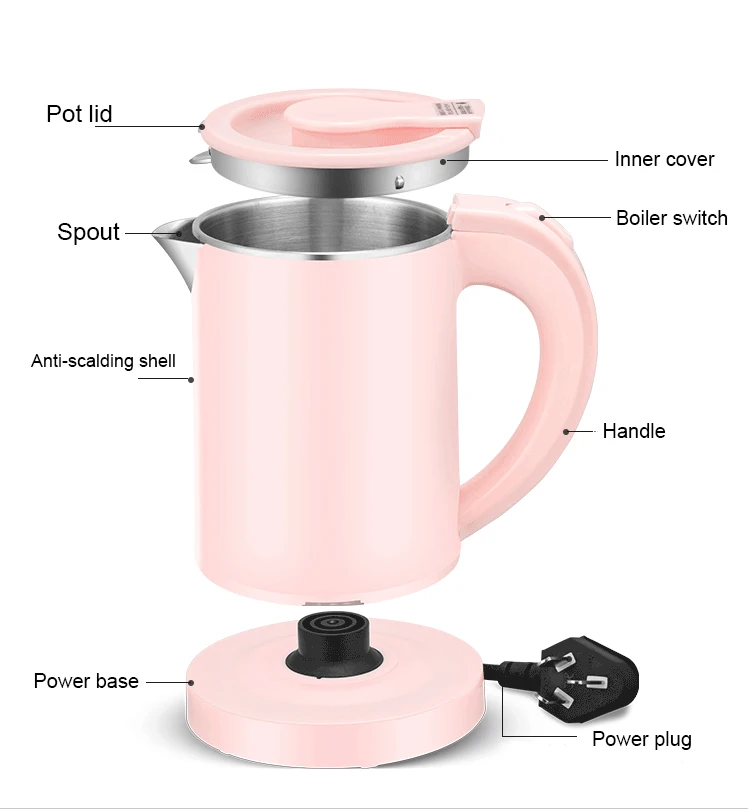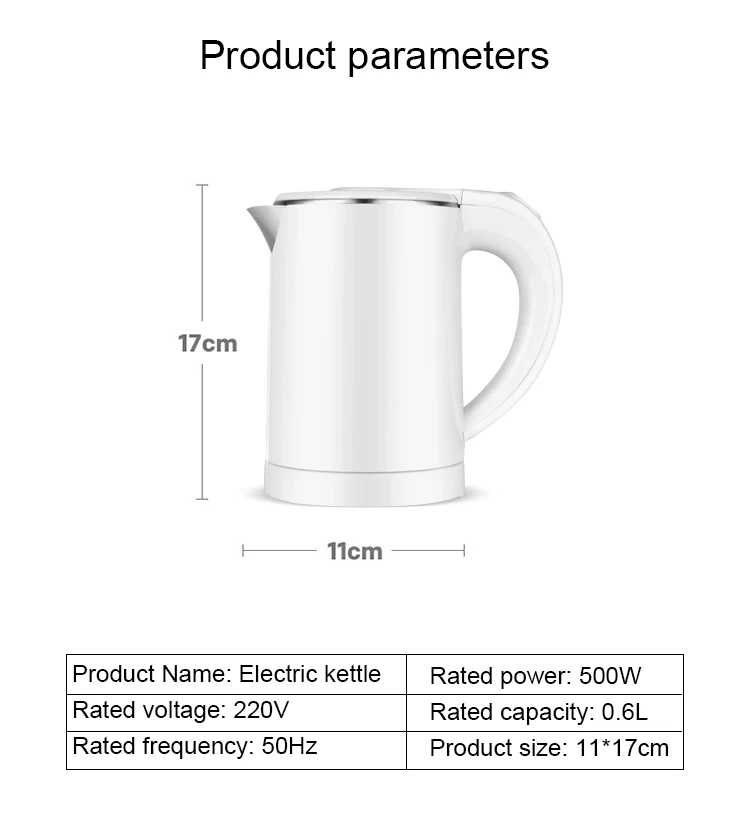Название продукта: Электрический чайникНоминальное напряжение: 220 ВНоминальная частота: 50 ГцНоминальная мощность: 500 ВтНоминальная емкость: 0.6лРазмер изделия: 11*17 см
