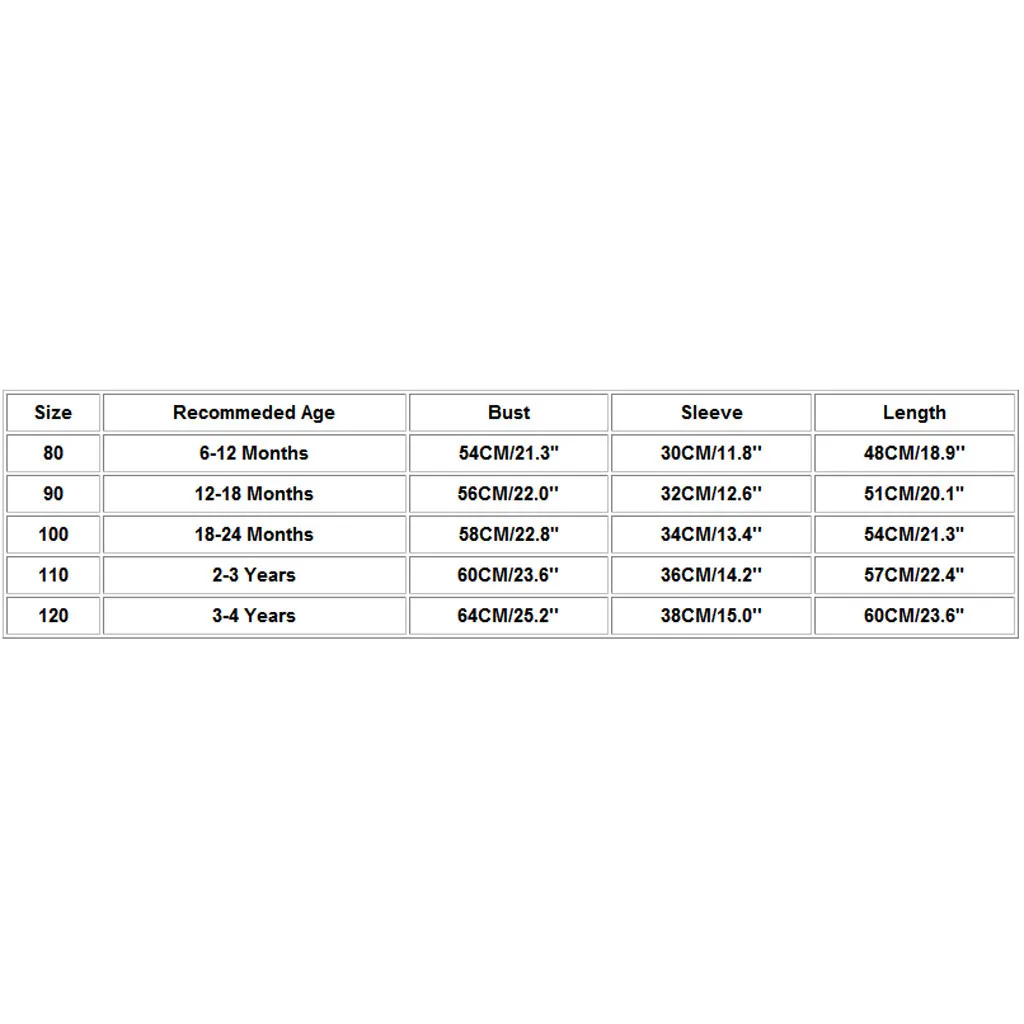 Таблица размеров: РазмерРекомендуемый возрастБюстРукавДлина806-12 месяцев54 см/21,3"30 см/11,8''48 см/18,9''9012-18 месяцев56 см/22,0''32 см/12,6 дюйма51 см/20,1"10018-24 месяцев58 см/22,8"34 см/13,4''54 см/21,3"110От 2 до 3 лет60 см/23,6''36 см/14,2''57 см/22,4"120От 3 до 4 лет64 см/25,2''38 см/15,0''60 см/23,6" Размер: 80Рекомендуемый возраст: 6-12 месяцевБюст: 54 см/21,3"Рукав: 30 см/11,8 дюймаДлина: 48 см/18,9''Размер: 90Рекомендуемый возраст: 12-18 месяцевОбхват груди: 56 см/22,0 дюймаРукав: 32 см/12,6 дюймаДлина: 51 см/20,1"Размер: 100Рекомендуемый возраст: 18-24 месяцевБюст: 58 см/22,8"Рукав: 34 см/13,4 дюймаДлина: 54 см/21,3"Размер: 110Рекомендуемый возраст: От 2 до 3 летОбхват груди: 60 см/23,6 дюймаРукав: 36 см/14,2 дюймаДлина: 57 см/22,4"Размер: 120Рекомендуемый возраст: От 3 до 4 летОбхват груди: 64 см/25,2 дюймаРукав: 38 см/15,0 дюймаДлина: 60 см/23,6"