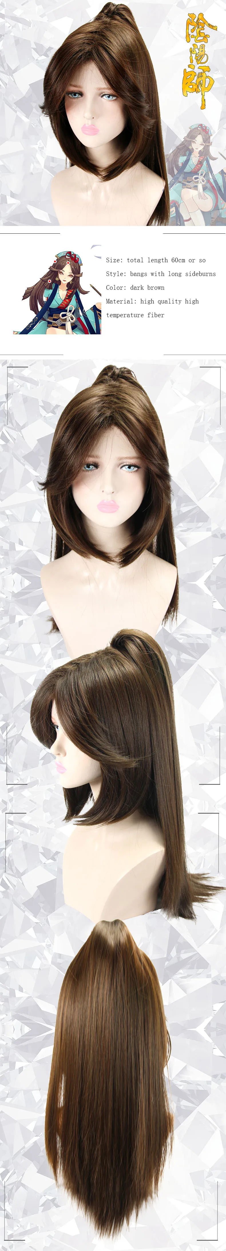Размер: Общая длина около 60 см Стиль: челка с длинными бакенбардами Цвет: темно-коричневый Материал: высококачественное Термостойкое волокно