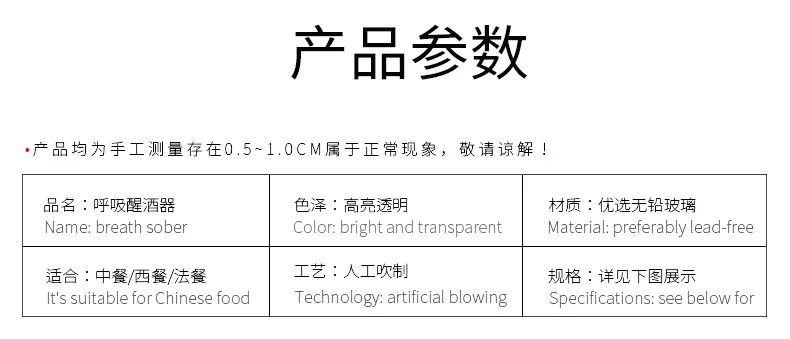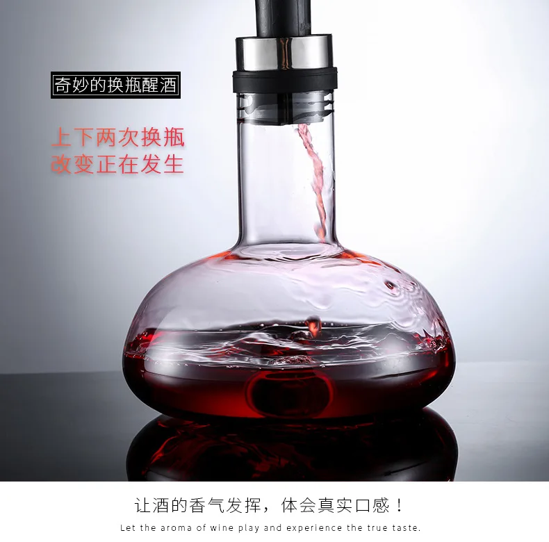 Название продукта: дышащий графин Материал: бессвинцовое Хрустальное стекло 304 нержавеющая сталь Еда класс силикагель Процесс: ручной выдув, Холодная резка Емкость: 1400 мл/1500 мл Термостойкость: в пределах 60 градусов Это занимает всего несколько минут, чтобы закончить традиционное отрезвляющее время несколько часов. В пробковой направляющей, разработанной патентом, Налейте бутылку вина одним и тем же способом вверх дном всего два раза. Давление и поток воздуха могут быстро напомнить о introverted аромате и достичь мягкого вкуса за короткое время!