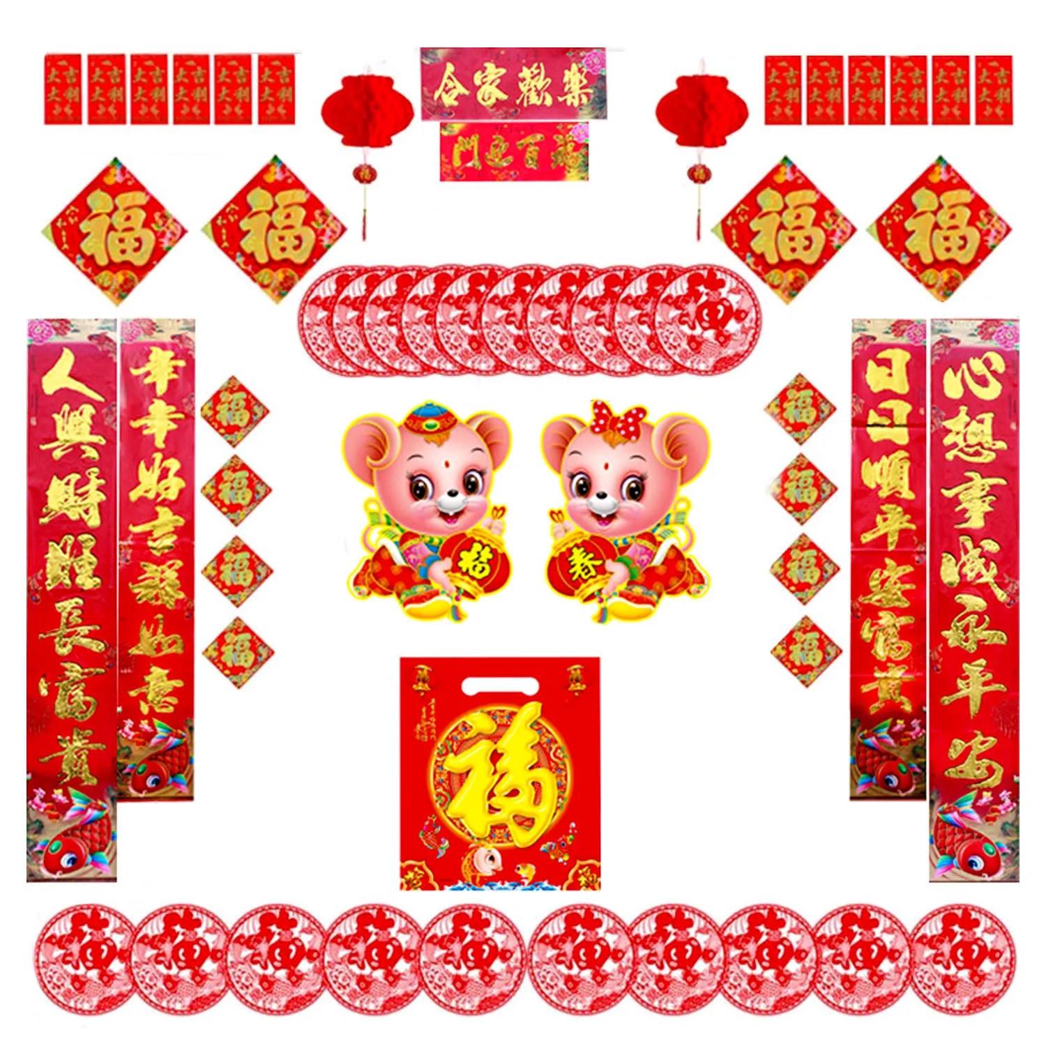 Набор включает в себя 12 красных конвертов, 2 бумажных фонарика, 20 наклеек фу, 12 символов фу, 2 пары длинных дупет, 1 пару наклеек на дверь и 1 Подарочный пакет, всего 55 шт. Полный набор, который поможет вам украсить свой дом в предстоящем китайском новом году!