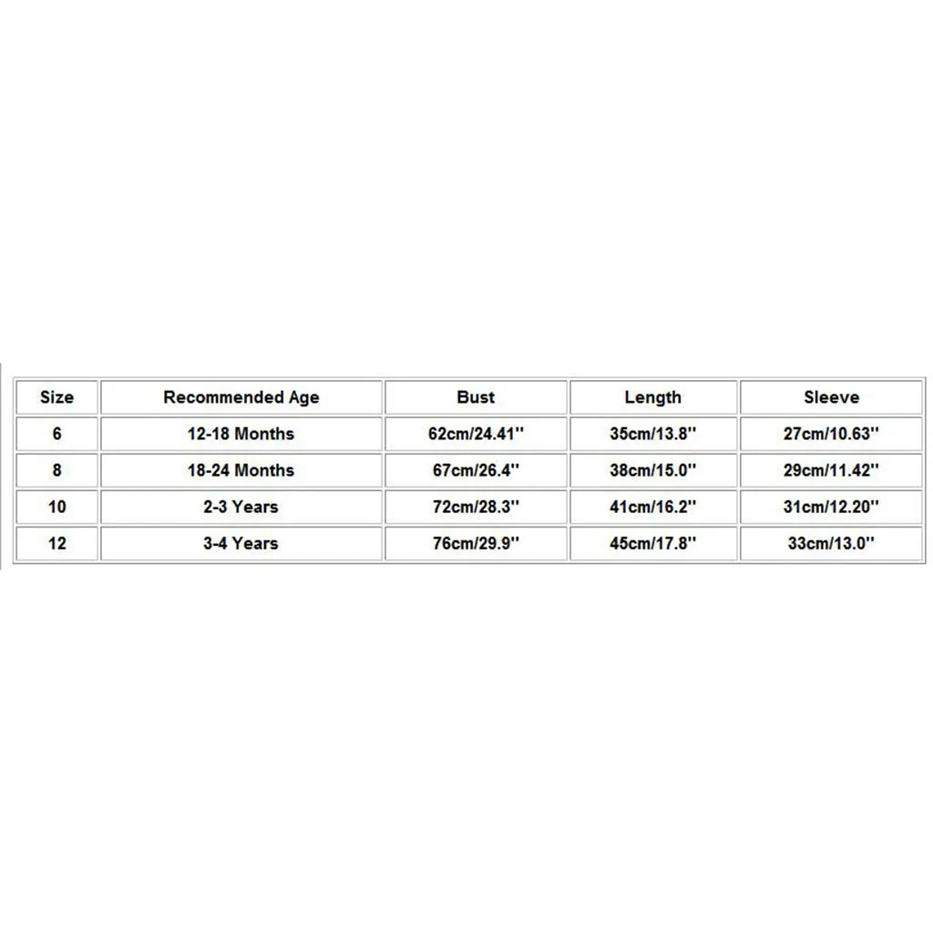 Размер Рекомендуемый возраст Бюст Длина Рукав 6 12-18 месяцев 62 см/24,41'' 35 см/13,8'' 27 см/10,63'' 8 18-24 месяцев 67 см/26,4'' 38 см/15,0'' 29 см/11,42'' 10 От 2 до 3 лет 72 см/28,3'' 41 см/16,2'' 31 см/12,20'' 12 От 3 до 4 лет 76 см/29,9'' 45 см/17,8'' 33 см/13,0''