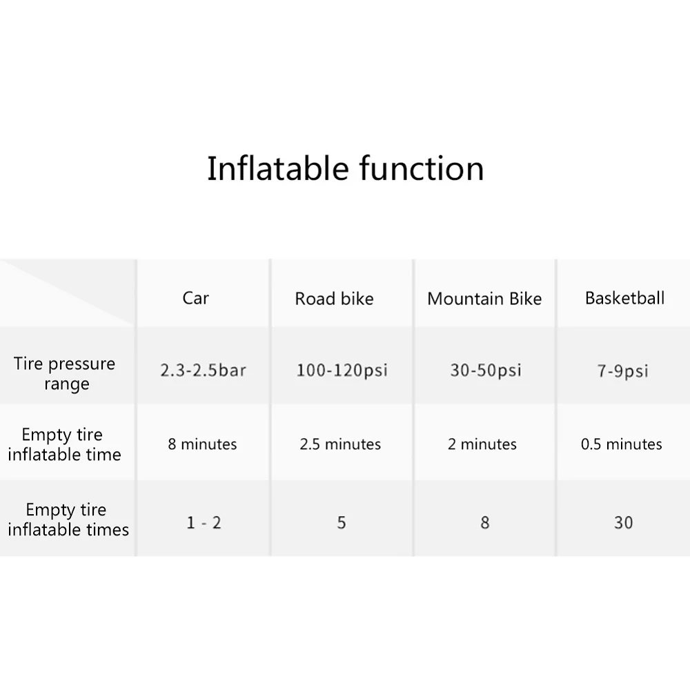 Этот мини-перезаряжаемый насос легко поместится в небольшой упаковке, просто носите его с собой во время езды в чехол, который ваш велосипед должен надуваться на пути, и это может быть также банк питания и освещение в чрезвычайной ситуации. Хороший компаньон для гонщиков! Особенности: Около 2,5 минут 100-120PSI за 1 дорожный мотоцикл шины, около 2 минут 30-50PSI за 1 горный велосипед шины, около 0,5 минут 7-9PSI за 1 Баскетбол, около 8 минут 2,3-2.5bar для автомобильных шин. 150PSI и точный контроль давления для быстрого надувания, удобный насос позволяет носить с собой и надувать ваши шины в чехол аварийной плоской шины на дороге. Установите значение давления, и машина автоматически выключается, когда достигнет целевого значения. Встроенный перезаряжаемый аккумулятор и около 2,5 часов полной зарядки. Четкий ЖК-дисплей показывает текущее значение давления. Может быть банком питания, когда ваш телефон не работает в аварийной ситуации. Легко крепится на велосипед с установочным аксессуаром или просто помещается в небольшой упаковке для вашего велосипеда, автомобиля, баскетбола и плавательного кольца. Технические характеристики: Материал: Поликарбонат и АБС-пластик Батарея Емкость: 4*3,2 V/500 мА * ч перезаряжаемого литий-Батарея Рабочий ток: 1 ~ 5A Время зарядки: 2,5 часов Режим зарядки: Micro-USB Максимальное давление: 150 фунтов на кв. дюйм/10 бар/90 кПа/10.5 кг/см2 Рабочая температура: -10 °C ~ + 60 °C(14 °F ~ 140 °F) Вес хоста: 340 г/11,9 унций Размеры: 18*5,5*5,5 см/7,0*2,1 * 2.1in Посылка Вес: 556g / 1.2lb Посылка список: 1 * насос 1 * Воздушная трубка 1 * FV адаптер 1 * игла 1 * воздушный кран для ванны 1 * USB кабель 1 * шестигранный ключ, дюймовый стандарт 2 * Нескользящие коврики 2 * винта 1 * велосипедный кронштейн 1 * крепежная лента 1 * сумка для переноски 1 * Руководство пользователя Примечание: 1. Если насос выдает ненормальный звук во время надувания или чрезмерная температура, пожалуйста, прекратите использование. 2, пожалуйста, держите подальше от легковоспламеняющихся и взрывоопасных веществ и оставайтесь с насосом во время надувания. 3. Воздушная трубка и насос легко нагреваются при непрерывной аэрации, пожалуйста, прекратите надувать, чтобы охладить насос, прежде чем использовать его снова.