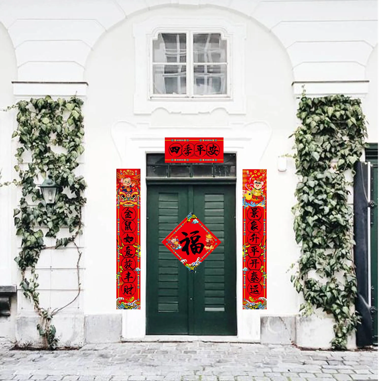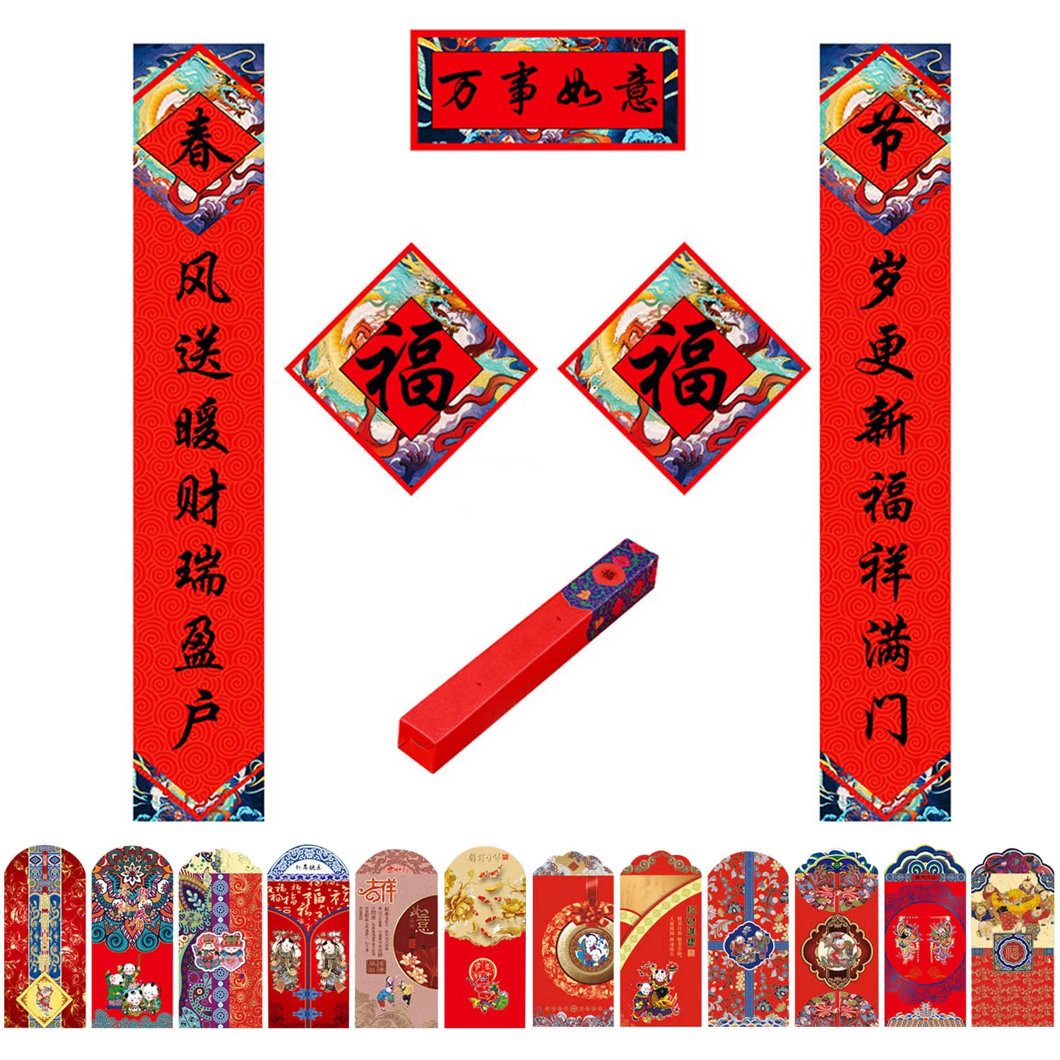 Отличный Китайский Лунный Новый год, набор для украшения дома, включает в себя 1 пару длинных курток, 2 персонажа фу, 1 подарочная коробка, 12 красных конвертов в случайные стили