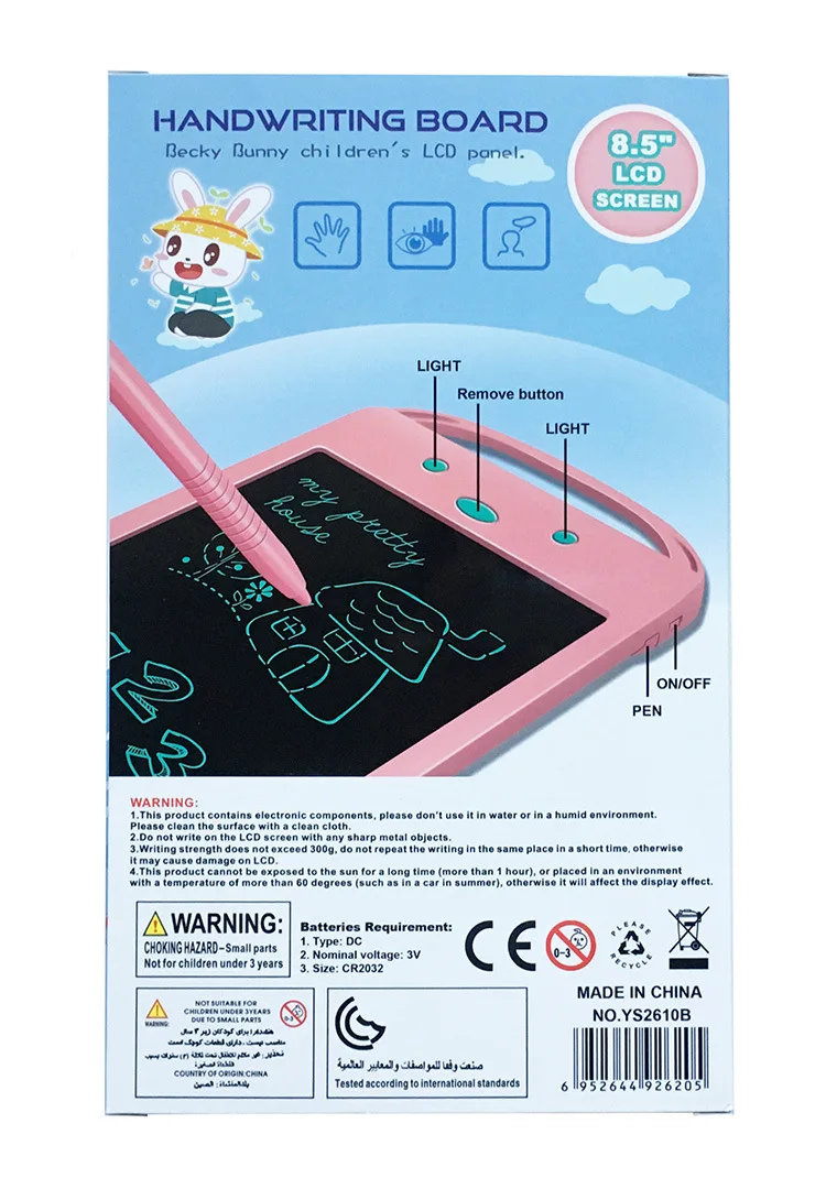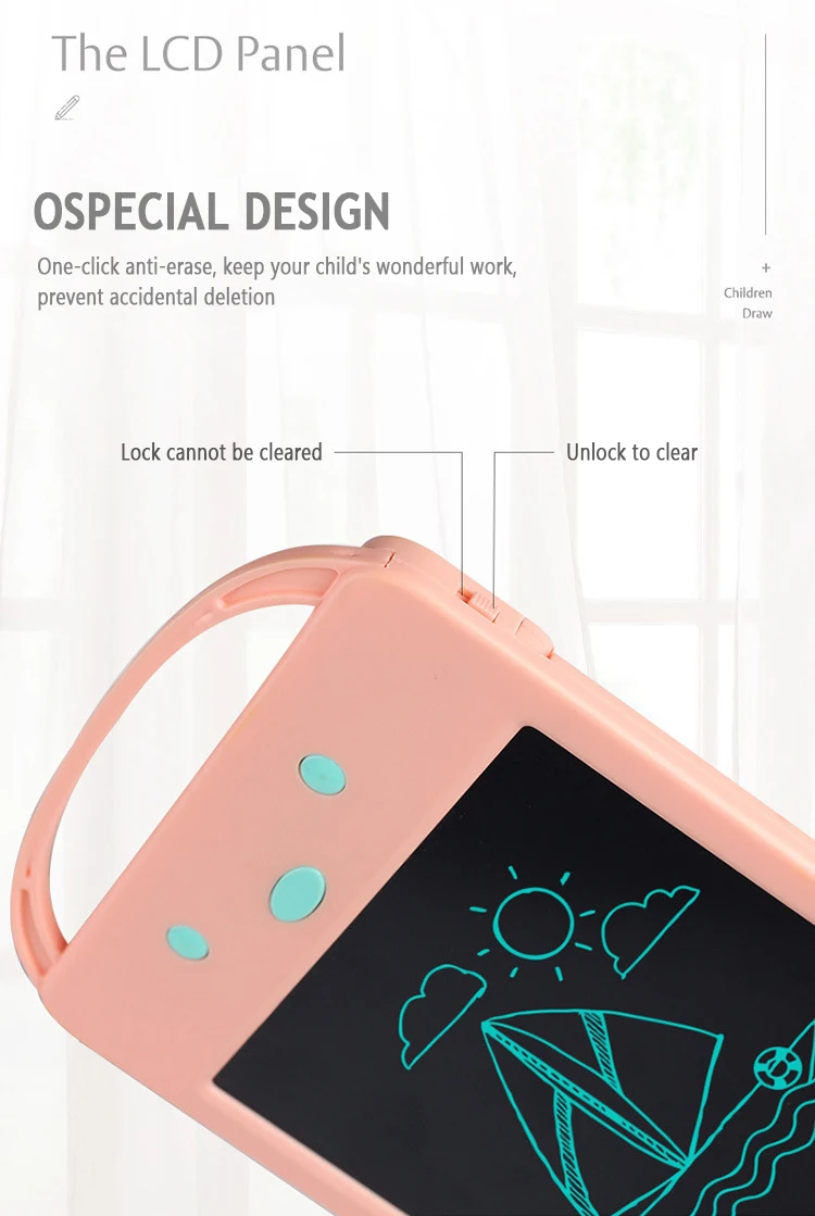 Доска для письма с ЖК-экраном 8,5 дюйма, доска для письма для раннего образования для детей, Взрывные модели, креативная электронная доска для рисования граффити, стирание одним нажатием, деликатные мазки кистей, неограниченные граффити, это характеристики этого продукта. Противостоять и написать износостойкий защитный экран для глаз, который не повредит глаза детей. При использовании также будет Водонепроницаемая функция, которая может блокировать брызги воды и предотвратить повреждение внутренних компонентов. Интимная конструкция крючка может использоваться как доска для сообщений и передает хорошее сообщение семье. Ручка для сенсорного экрана портативная и может использоваться в любое время, чтобы предотвратить ее потерю. Не нужно время, чтобы найти его. Чертежи заметок и чертежи не удовлетворены, быстро понятно, без резины. Строго прошитый процесс литья под давлением с детальной текстурой. Этот продукт работает на батарее кнопки