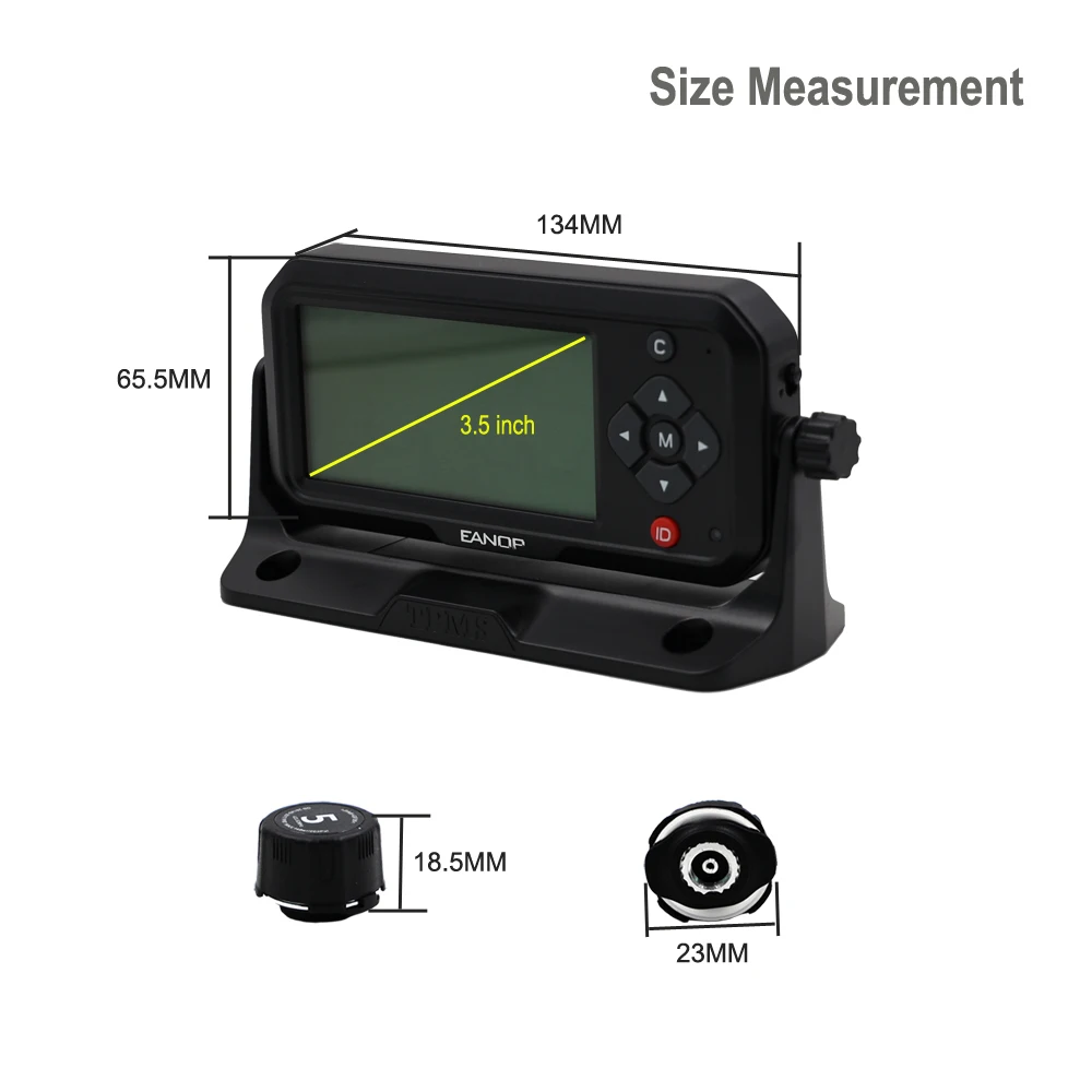 1: бренд EANOP warrentte 2: Большой ЖК-экран 3: Встроенная перезаряжаемая литиевая батарея 4: мониторинг в реальном времени на 8-16 шинах, температуры и давления 5: PSI, бар давления единиц 6: 14 бар/203PSI 7: Кабель питания Acc, поддерживает TPMS после включения двигателя Спецификация: Название бренда: EANOP Номер товара: TU200 Название продукта: TPMS для грузовика, Desgined для 6 колес Размер блока: 145*80*23 мм Вес: 250 г Рабочее напряжение: 12-24 В Блок контроля давления: PSI/Bar Максимальный сигнал давления: 14 бар/203PSI Рабочая температура: от 40 до 80 градусов Точность давления: 1.5Psi(0.1Bar) Настройка сигнализации для низкого давления: 4,5 бар (65PSI)-7,5 бар (109PSI) Настройка сигнализации для высокого давления: 7.6Bar (110PSI)-14Bar (203PSI) Частота передачи: 433,92 МГц