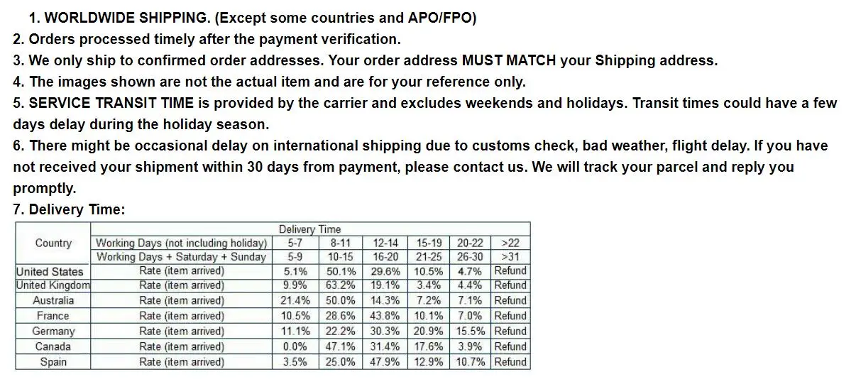 1. Мы хотим, чтобы вы были удовлетворены на 100%! 2. У вас есть 7 дней, чтобы связаться с нами и 30 дней, чтобы вернуть его с даты получения. Если данный товар находится в вашем распоряжении более 7 дней, он считается пользованным товаром и МЫ НЕ ПРОИЗВОДИМ ВОЗВРАТ ИЛИ ЗАМЕНУ. Исключений нет! Стоимость доставки оплачивается как продавцом, так и покупателем пополам. 3. Все возвращенные товары должны быть в оригинальной упаковке, и вы должны предоставить нам номер отслеживания доставки и конкретную причину возврата. 4. Мы вернем вам полную сумму после получения товара в его первоначальном состоянии и упаковке со всеми компонентами и аксессуарами, после того, как покупатель и продавец отменят сделку с aliexpress. Или вы можете выбрать замену Гарантия: 1. 12 месяцев ограниченной гарантии производителя на дефектные изделия (за исключением предметов, поврежденных и/или неправильно использованных после получения). Аксессуары поставляются с 3-месячной гарантией. 2. Дефектные предметы должны быть зарегистрированы и возвращены в течение гарантийного срока (и в оригинальной упаковке, если это возможно). Вы должны описать дефект и предоставить номер вашего заказа. Мы не ремонтируем и не заменяем товары с истекшим сроком гарантии. 3. Желаем вам приятных покупок на aliexpress!