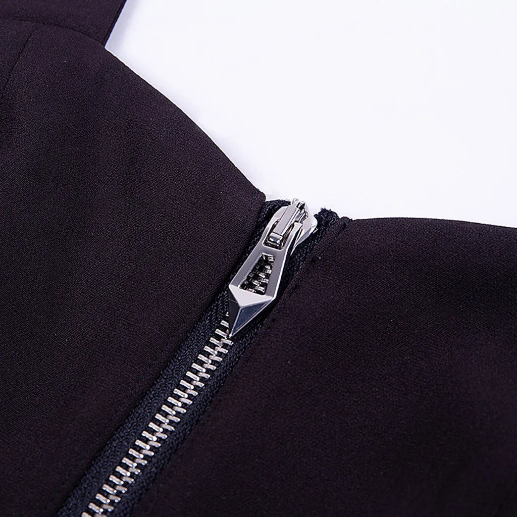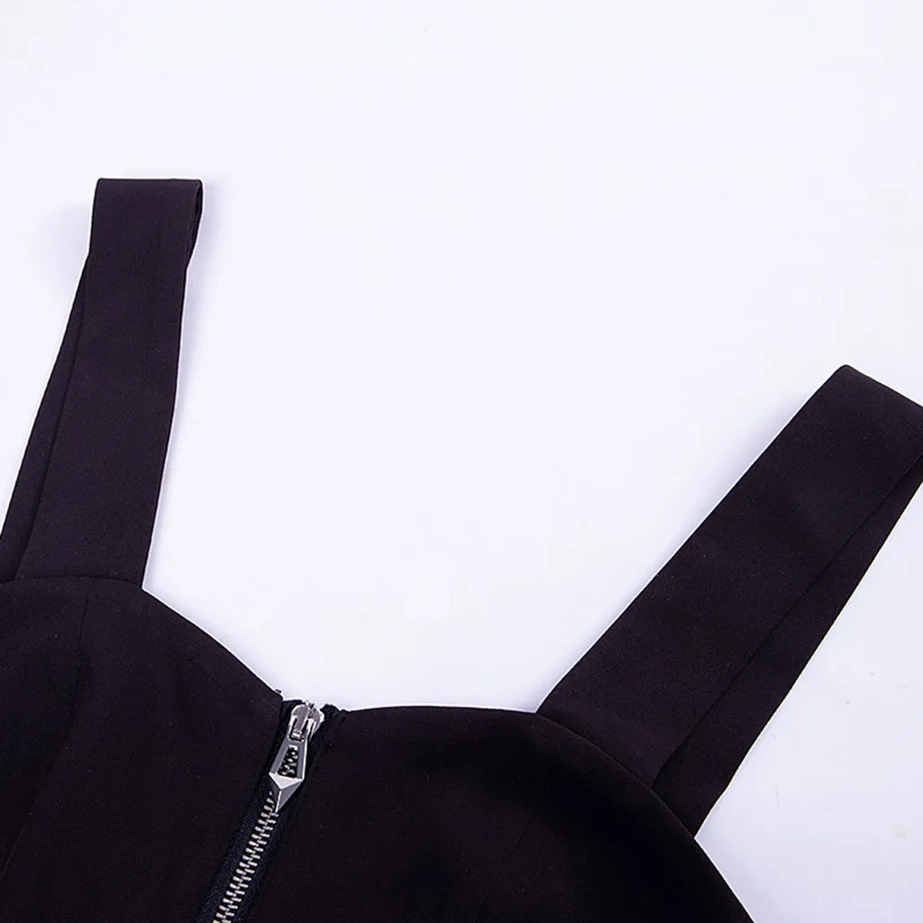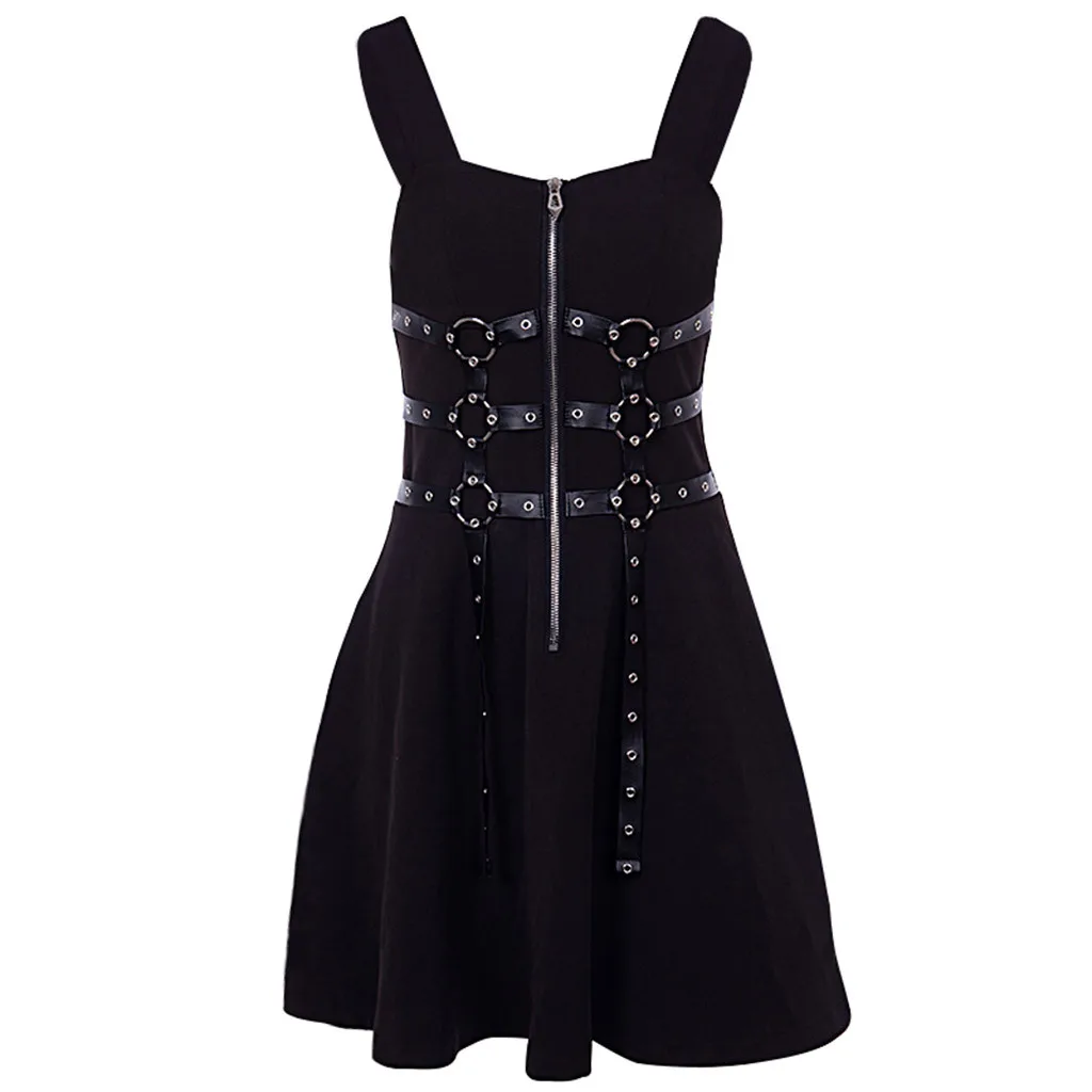 Women Black Zipper Pleated Strap Dress Gothic Street Punk Wind Cosplay Dress