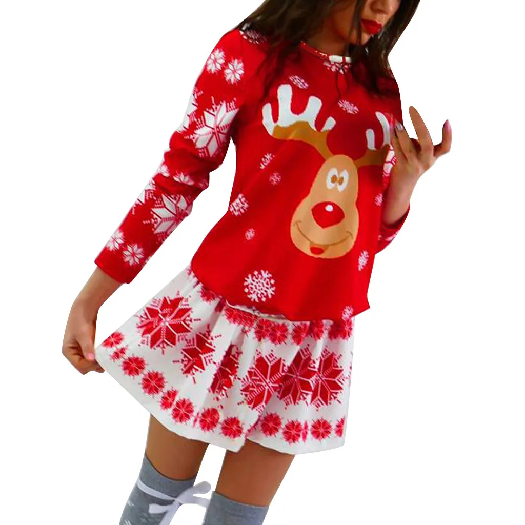 Особенности: Модное рождественское платье с круглым вырезом, принтом снежинок и лося; рождественское платье с длинными рукавами; мини-платье; Повседневный стиль; осенне-зимнее платье.