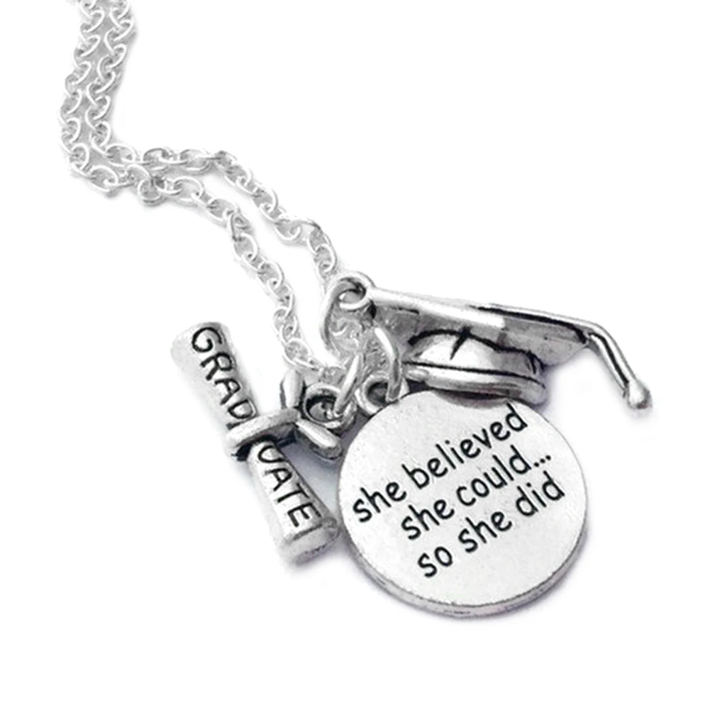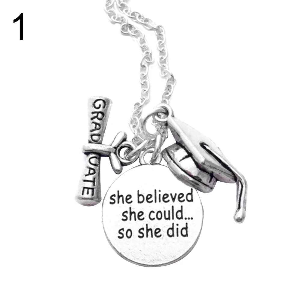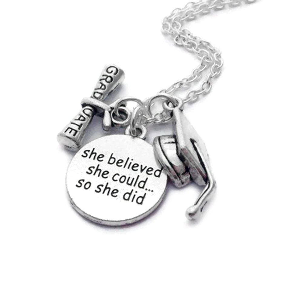 С надписью «она верила, что она может так сделать» круглая подвеска, колпачок для выпускного и амулеты для диплома.