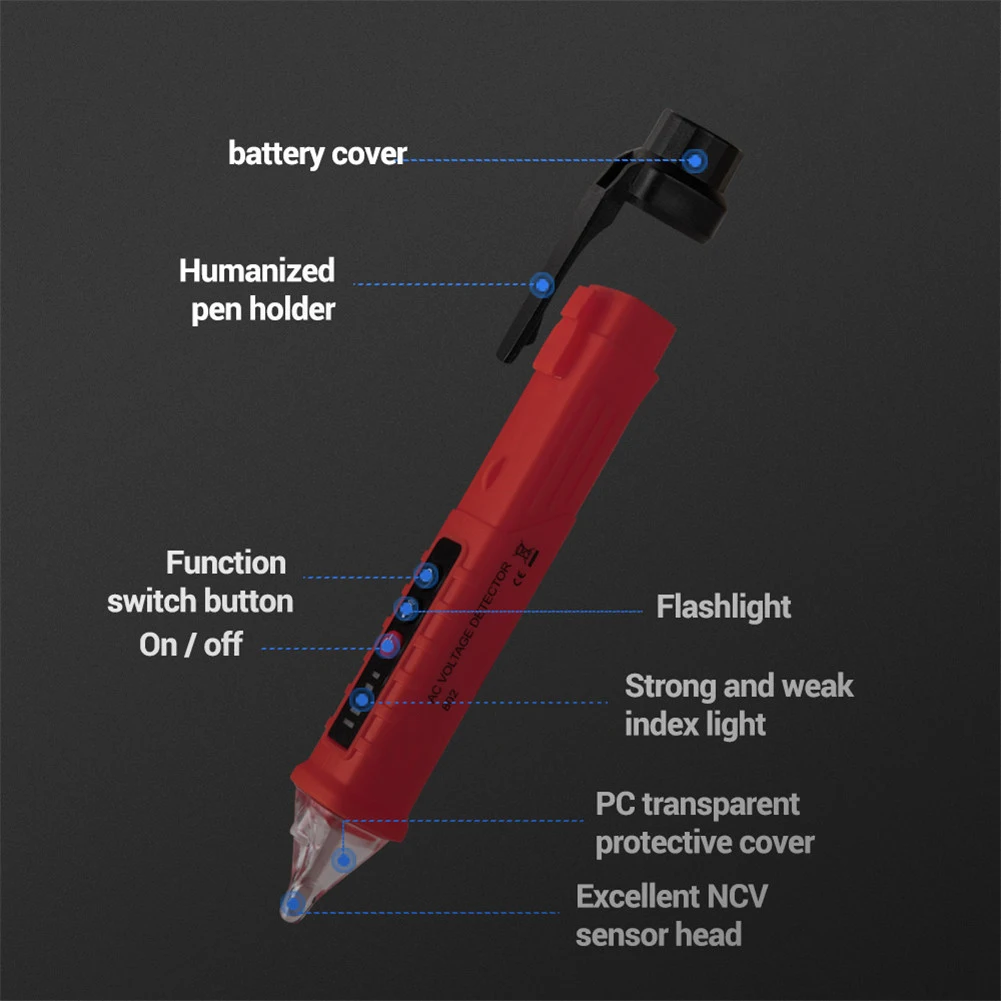 Точки пули: 1. Индуктивный сигнальный индикатор: поставляется с Индукционным зондом (Индукционная головка), фонариком и индуктивным сигнальным индикатором напряжения. Индикатор силы сигнала имеет высокий (H), средний (M), низкий (L) и другие функции. 2. Автоматическое отключение: тестер автоматически и безопасно отключится, когда тестер не работает около 5 минут, и сигнал напряжения не обнаружен. 3 、 Батарея пониженного напряжения индикация: в тех случаях, когда Батарея напряжение ниже примерно на 2,6 V, индикатор питания лампочка мигнет 3 раза и зуммер автоматически выключается при большом звук, пожалуйста, своевременно Замените аккумулятор. 4 、 Предупреждение Примечание: для того, чтобы избежать поражения электрическим током, не использовать крышку батарейного отсека перед тем, как это правильно фиксируется на месте. Для этого требуется 2 батарейки AAA (вам нужно подготовить самостоятельно). 5. Диапазон тестирования: тестер может обнаруживать напряжение в диапазоне от 12 до 1000 В. Характеристики: Название: бесконтактная Индукционная ручка Размер: около 156,3*26,2 мм/6,15*1,03 дюйма Материал: пластик Вес нетто: около 33 г Цвет: черный; Красный; Желтый Упаковочный лист: 1 * тестовая ручка 1 * Инструкция