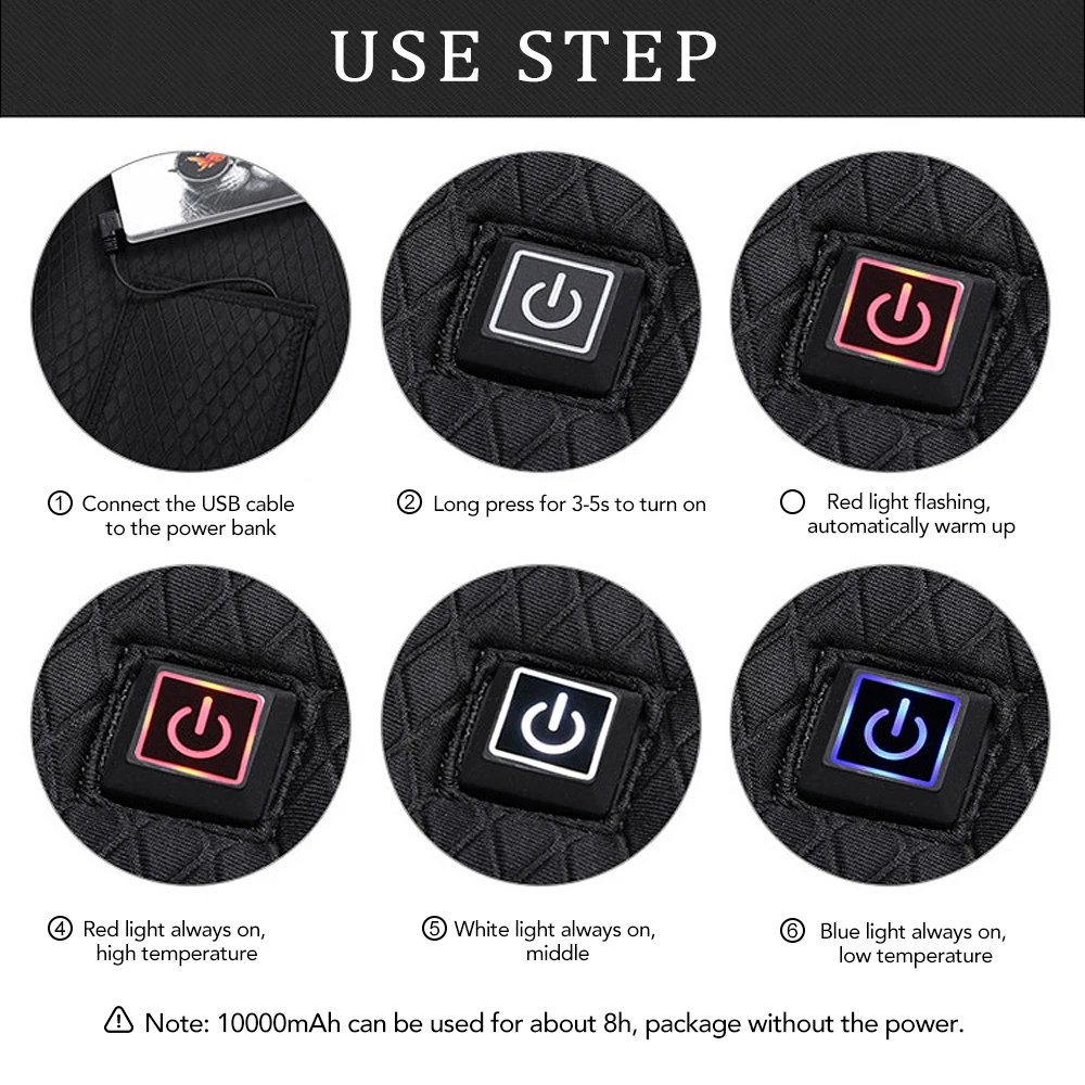 Усовершенствованные нагревательные элементы обеспечивают тепло спереди и сзади, чтобы вы чувствовали себя в тепле на 360 градусов. Одна кнопка для 3 настроек нагрева, изготовленная из мягкого приятного для кожи материала, который обеспечивает гладкое и комфортное ощущение. Дизайн с новейшим углеродным волокном и высококачественным термополиуретановым нагревательным листом для быстрого нагревания в течение 1-3 секунд.