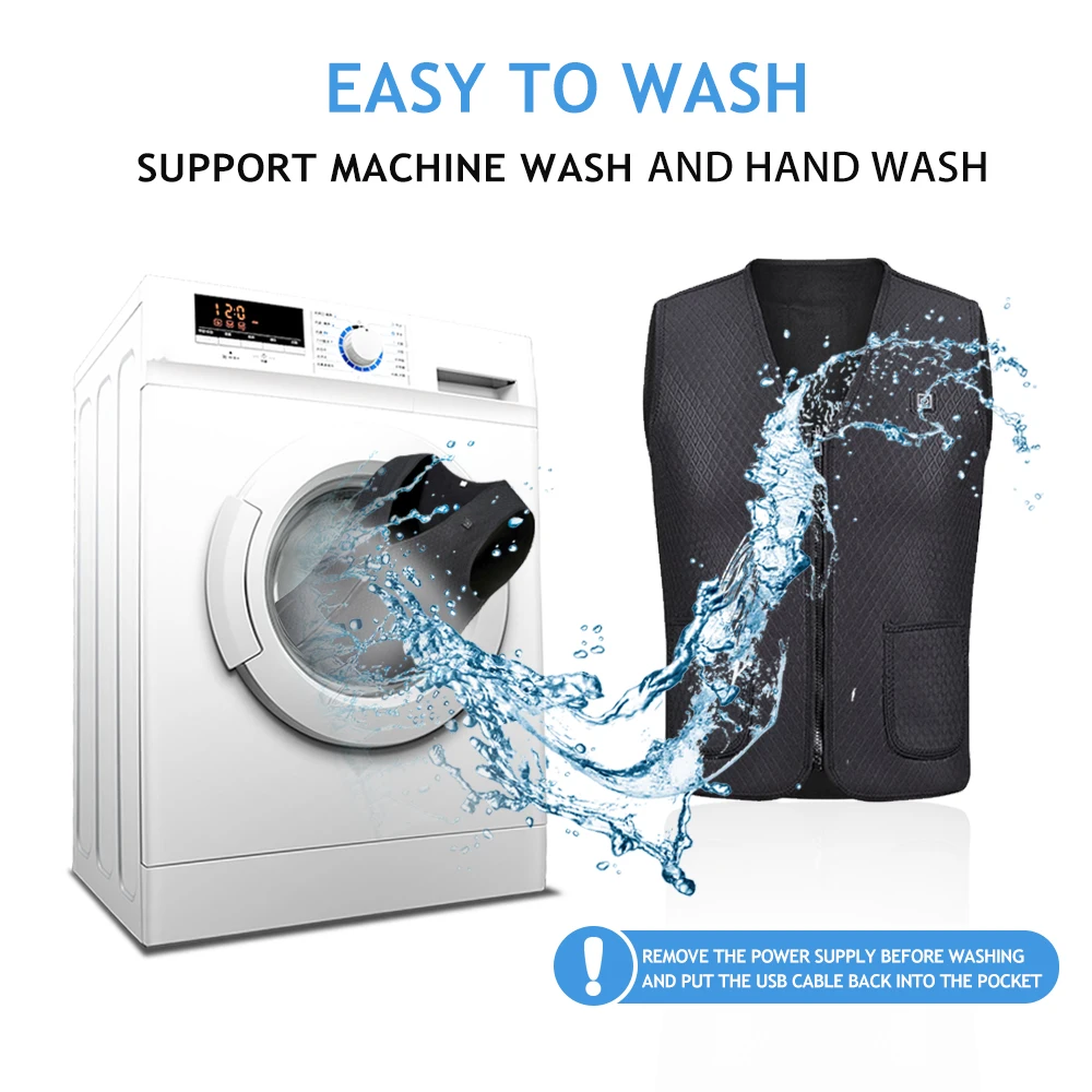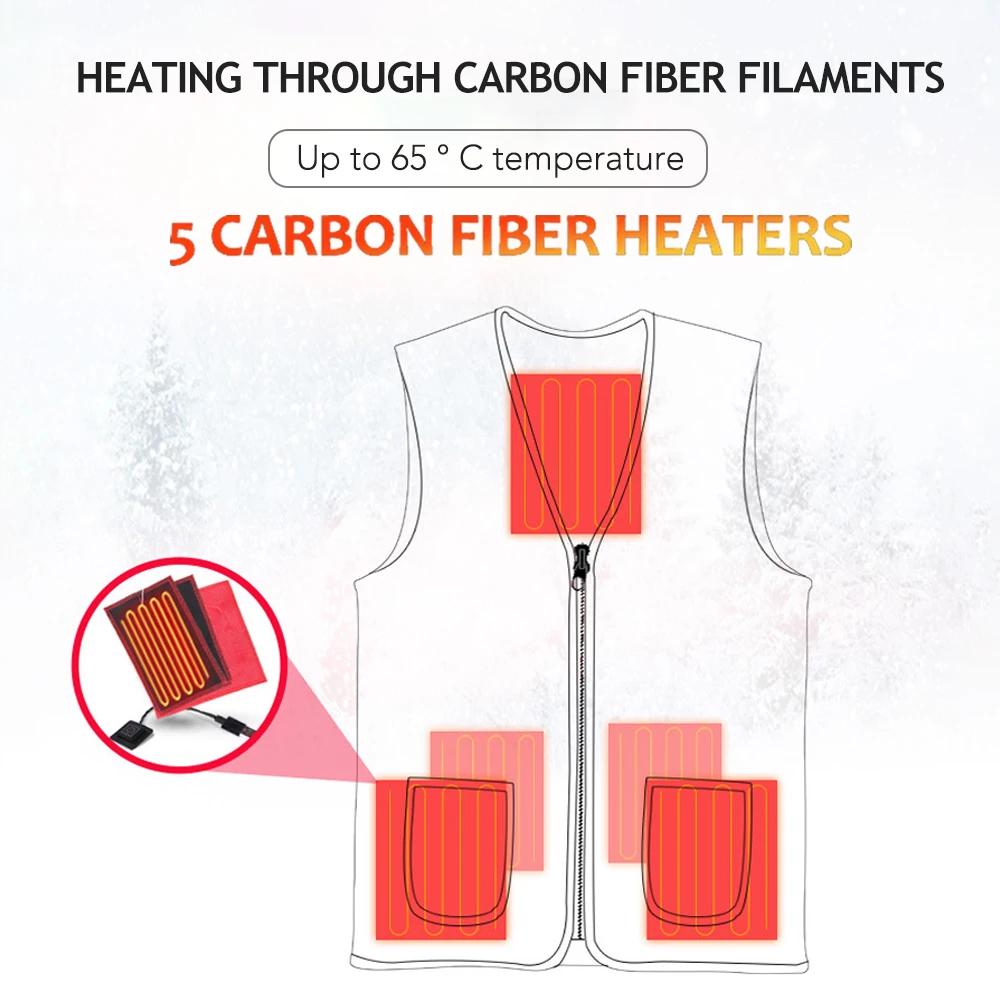 Утепленный жилет имеет 5 нагревателей из углеродного волокна (вокруг талии и спины). Материал подкладки одежды мягкий и удобный. Одежда с электрическим подогревом способствует циркуляции крови, облегчению боли в мышцах.