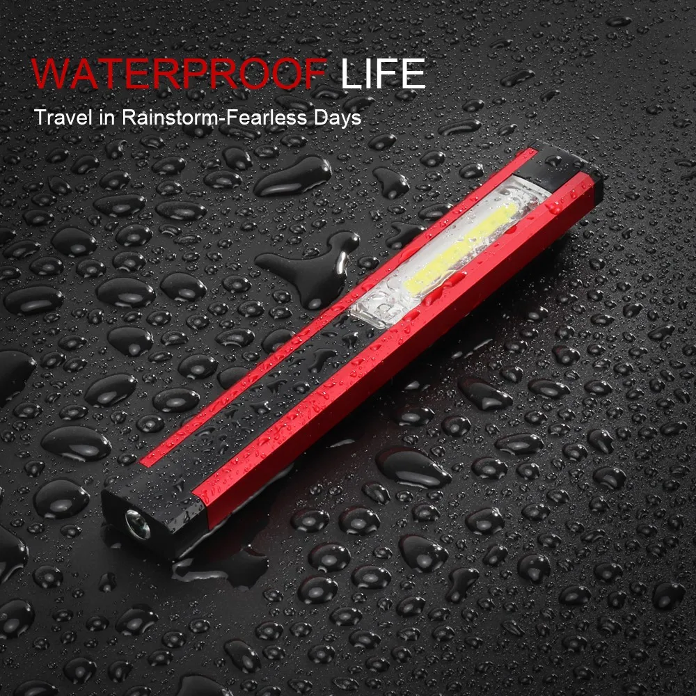Lamp type: XPE+C0B white light + COB red light Output power (maximum): 500lumen Running time (maximum): 3h Size (L*D): 175*23*12mm Material: aluminum + ABS plastic Weight: bare weight 59g with color box packaging and USB cable 81g Battery type used: built-in polymer battery(2400mAH) Function: 5 gear position, 1 position headlight XPE bright, 2 block COB strong light, 3 block COB light weak light, 4 block COB red light, 5 block COB flash. USB charging interface, side magnets.Package Included: