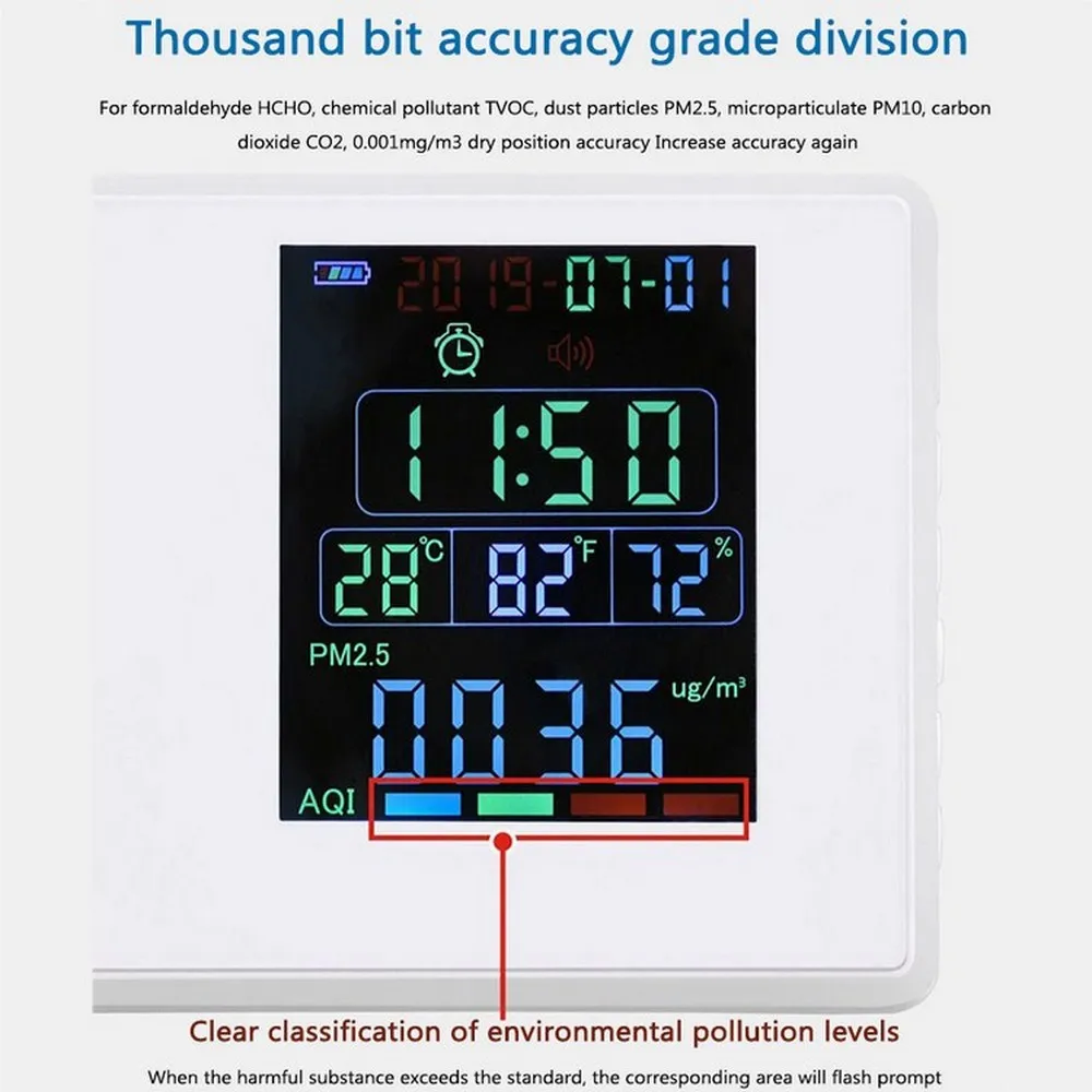 1. Высокоточная внутренняя и наружная система контроля качества воздуха с профессиональной технологией обнаружения. 2. Может обнаруживать HCHO/TVOC/CO2/PM2.5/PM10/температуру/влажность, может также устанавливать время диаплей, будильник и календарь.