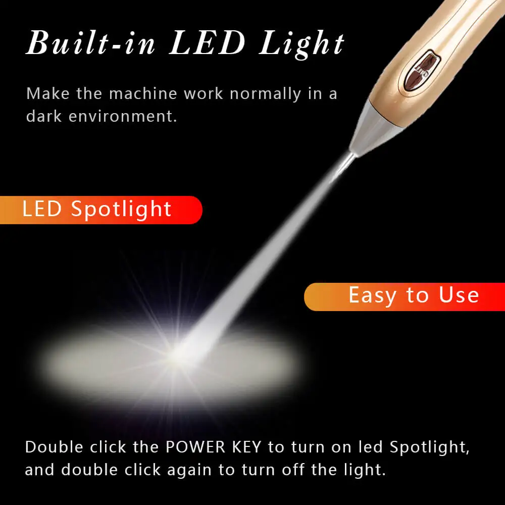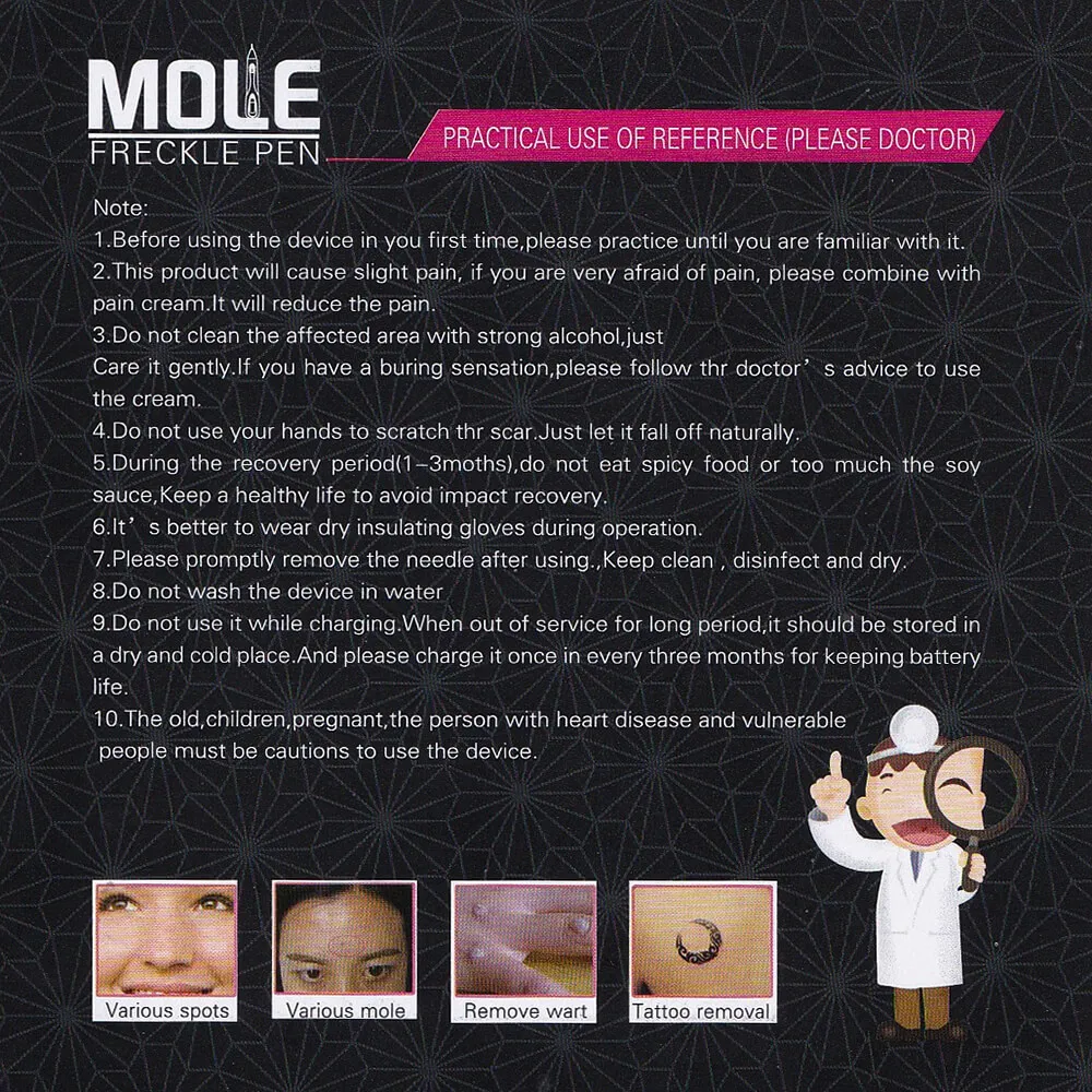 Особенности: 1. Легко подметать точечный тег, веснушки для Кротов 2. Безопасное и удобное управление устройством 3. 9 уровня для различных видов лечения 4. Светодиодный прожектор, встроенный литиевый аккумулятор, зарядка через USB Функции: 1. Удалите бородавку 2. Удалите татуировку 3. Удалите место 4. Удалите невус 5. Удаление грануляции 6. Удаляет все виды маленьких Кротов Посылка: 1 х прибор для удаления родинок ручка 30 х ватных тампонов 10 тонких игл 2 х грубых иглы 1 игольчатый чехол 1 x USB кабель для зарядки 1 x Руководство пользователя 1 х упаковочная коробка