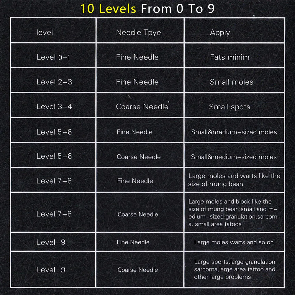 Посылка включает в себя: 1 х прибор для удаления родинок ручка 30 х ватных тампонов Тонкие иглы, 5 шт. 1 х грубая игла 1 игольчатый чехол 1 x USB кабель для зарядки 1 x Руководство пользователя 1 х упаковочная коробка 3 различных регулируемых уровня Без ЖК-дисплей дисплей