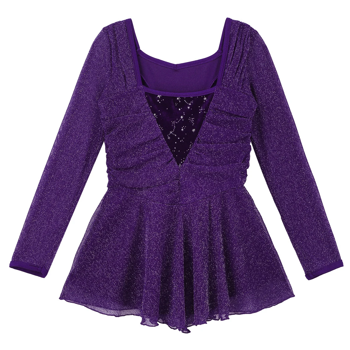 2 layers ruffled skirt are attached around waist, top glittery stretchy tulle layer, 1 layer lycra. With built-in bottoms. Beautiful dancewear for your girl.